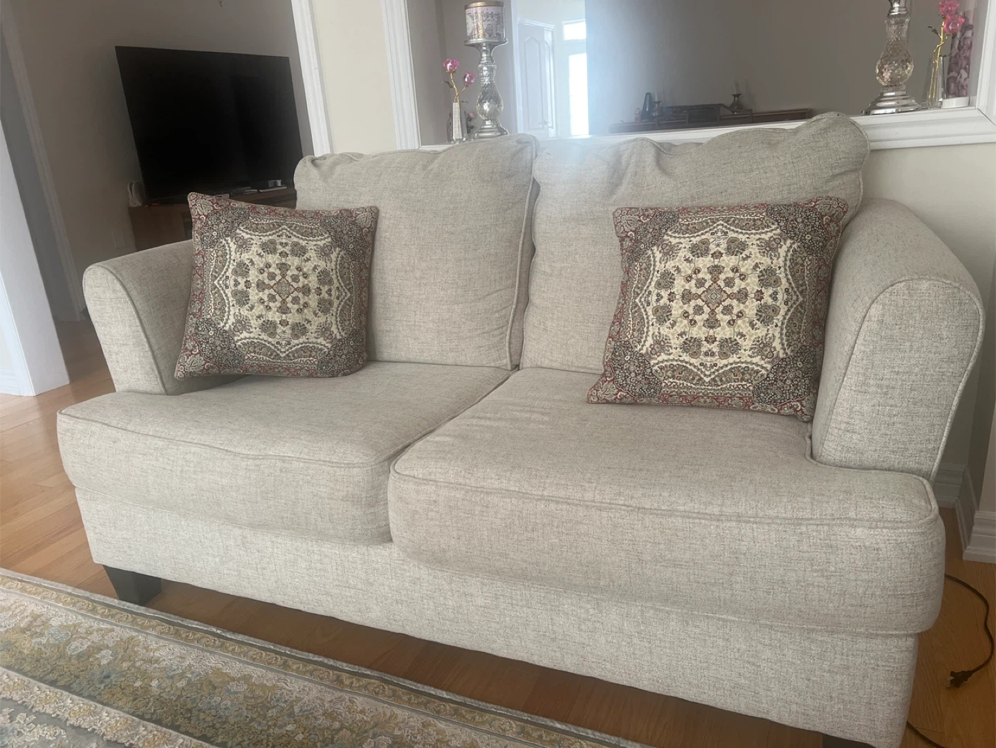 This is a comfortable light grey loveseat sofa. It includes two decorative throw pillows with an ornate pattern. The sofa is upholstered in a textured fabric and has a neutral tone that fits most decors. Who would this be useful for? Someone looking for a cozy seating option for a smaller space!