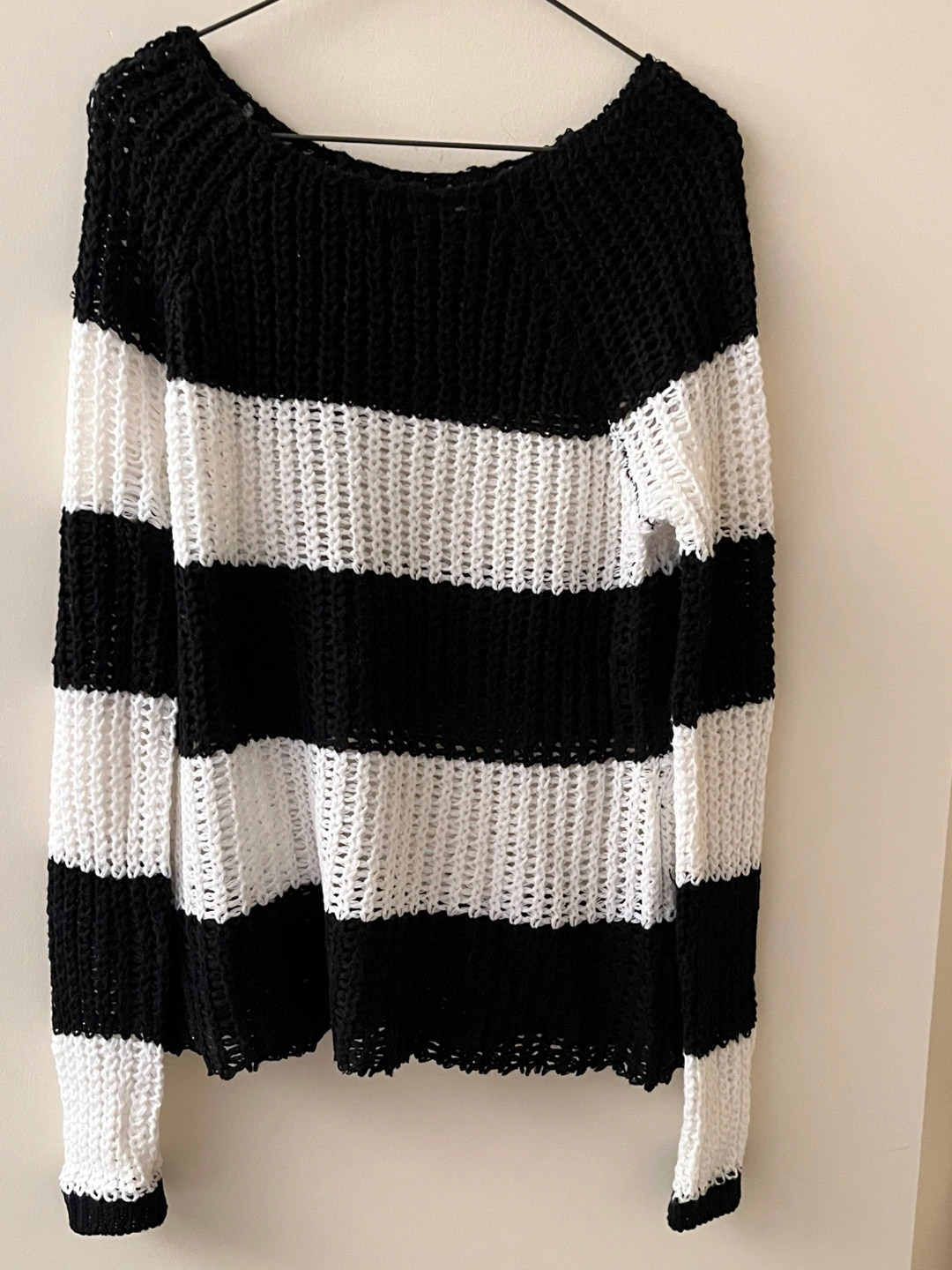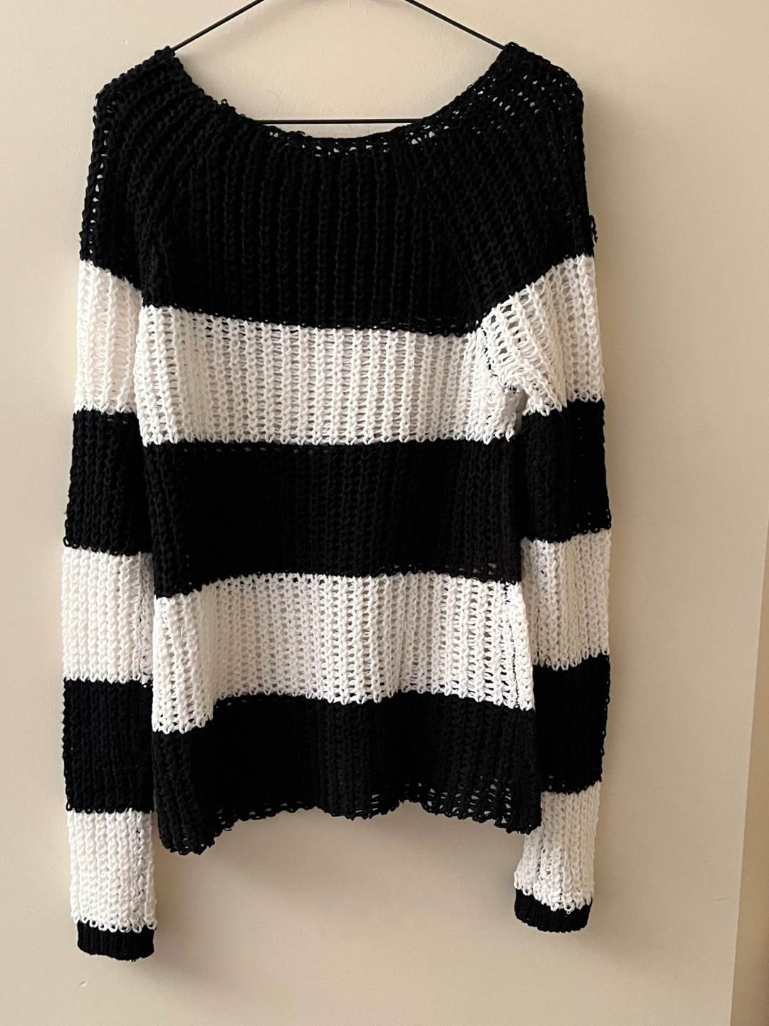 Black and white striped knit sweater. Long sleeves. Open knit material. Size medium.