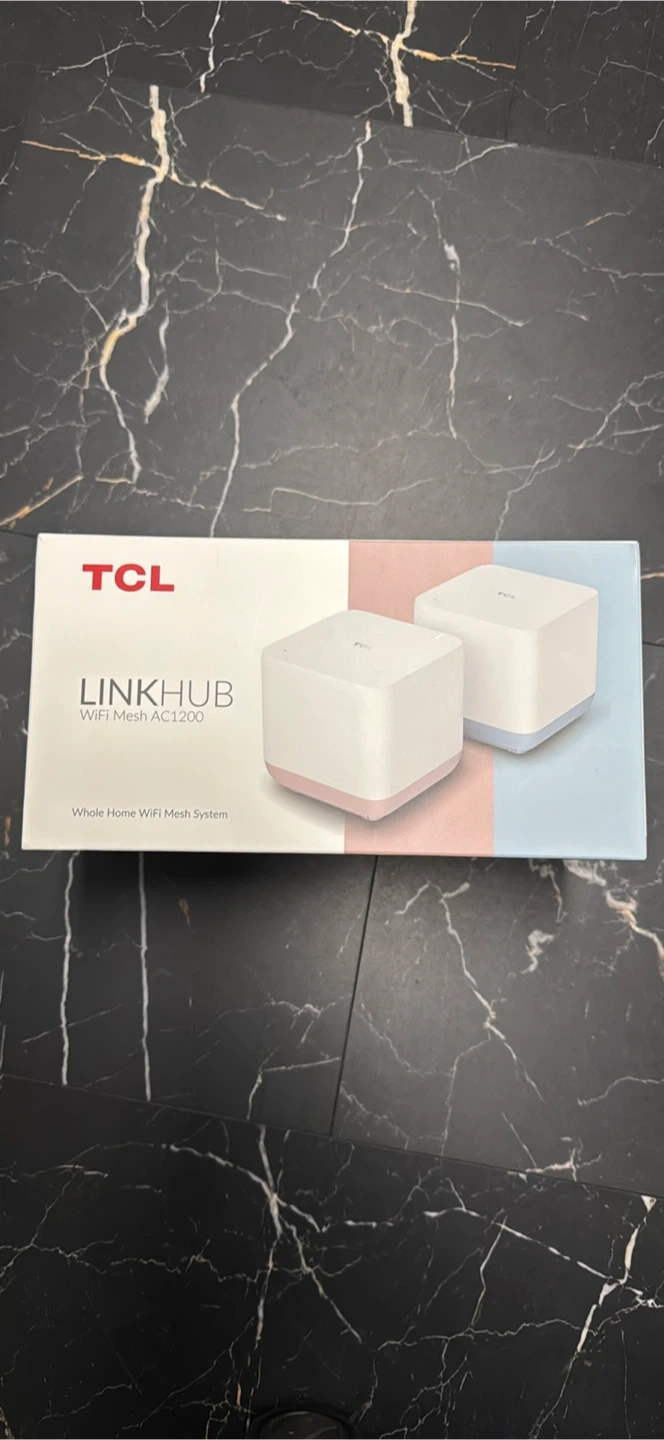 Selling a TCL Linkhub WiFi Mesh AC1200 whole home WiFi system. It comes with two mesh units and is designed to provide seamless, high-performance wireless WiFi coverage. The box includes: - 2 Mesh Units - 2 Power Adapters - 1 Gigabit Ethernet Cable Model: WS1G