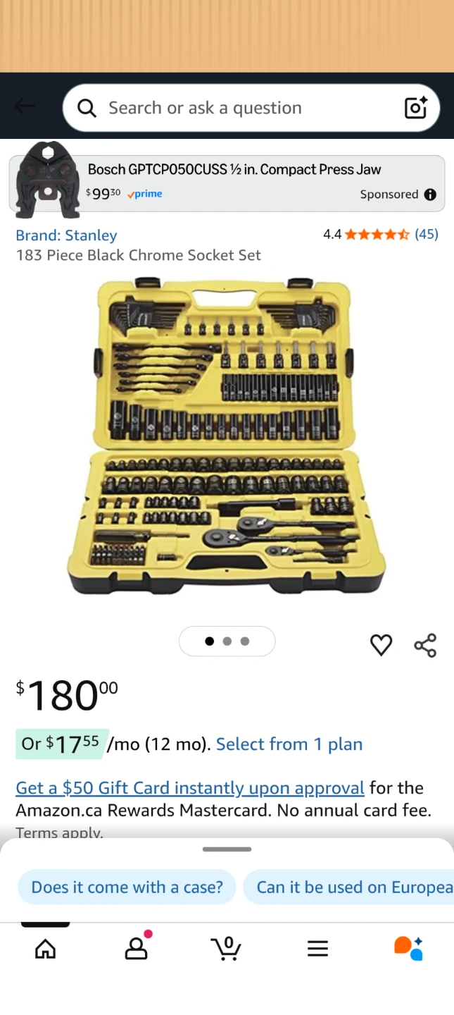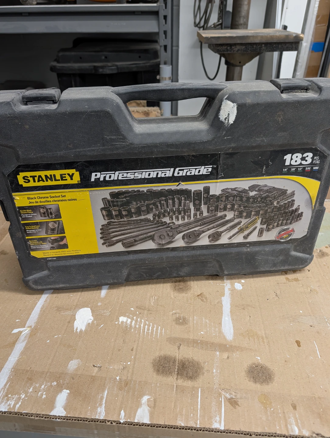 Hardly used, just Dusty from sitting around. Stanley Professional Grade 183-piece black chrome socket set. It comes in a durable carrying case. Includes a variety of sockets, ratchets, and accessories.