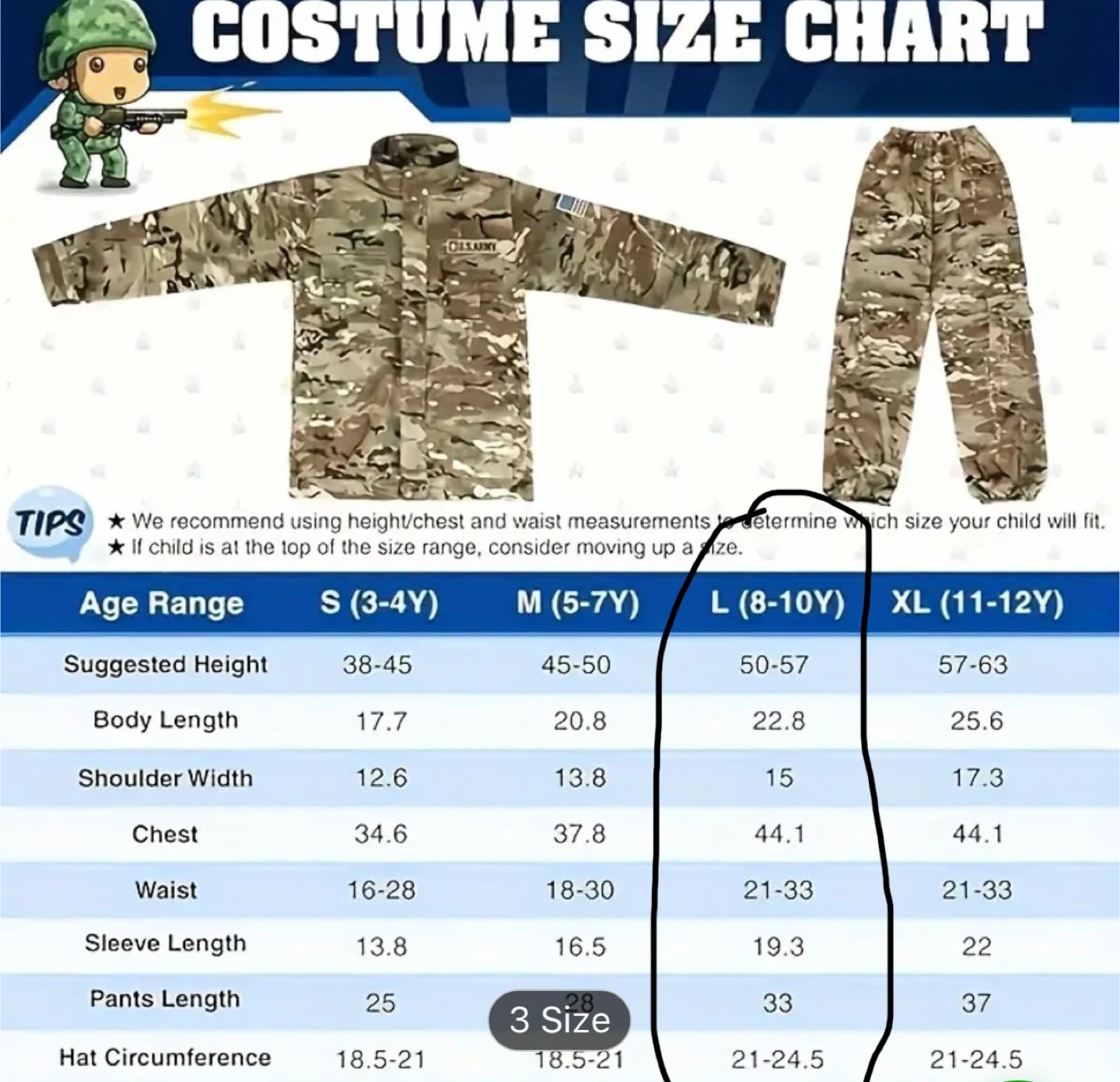 Size L. For 8-0 years old kids