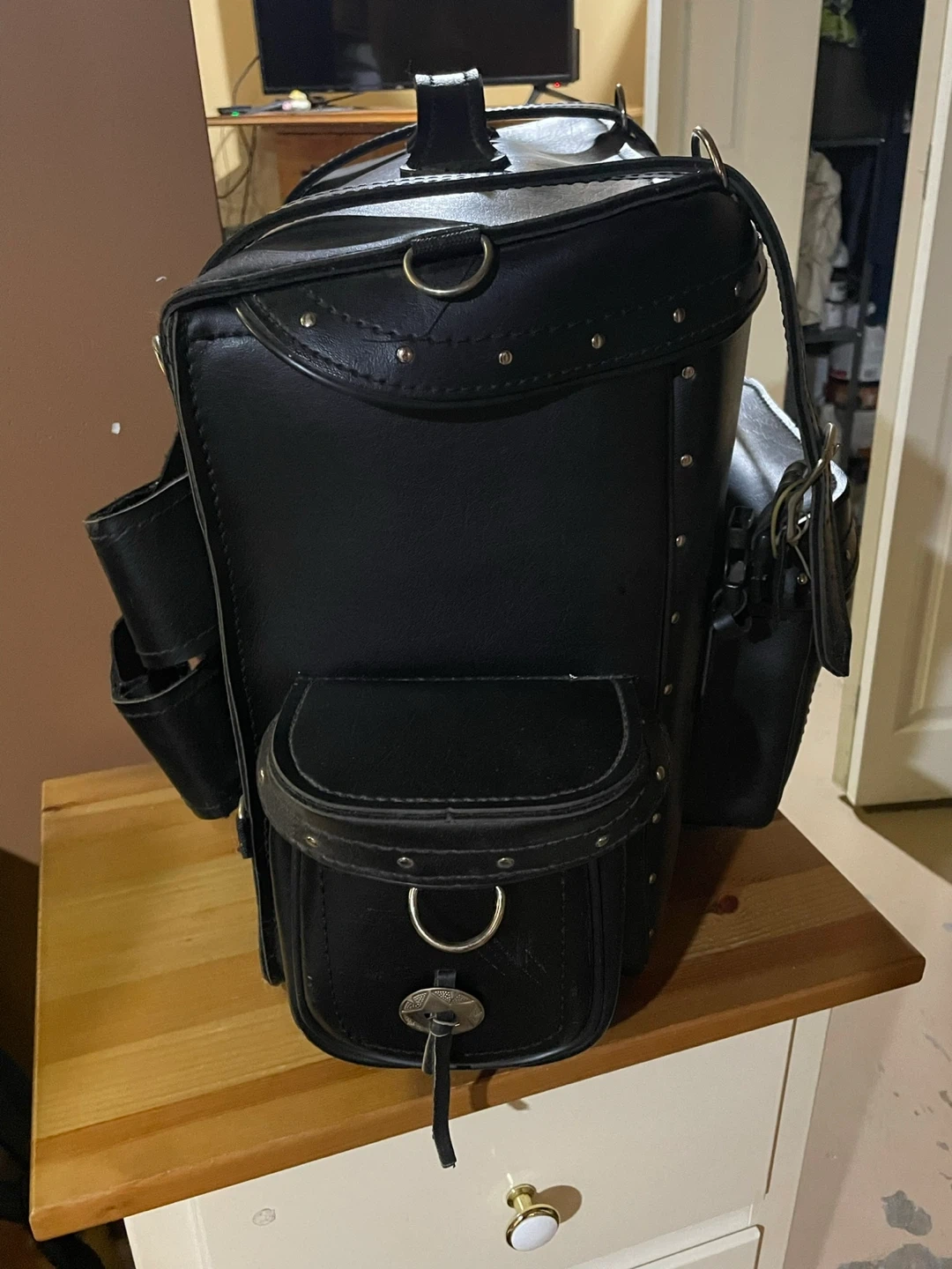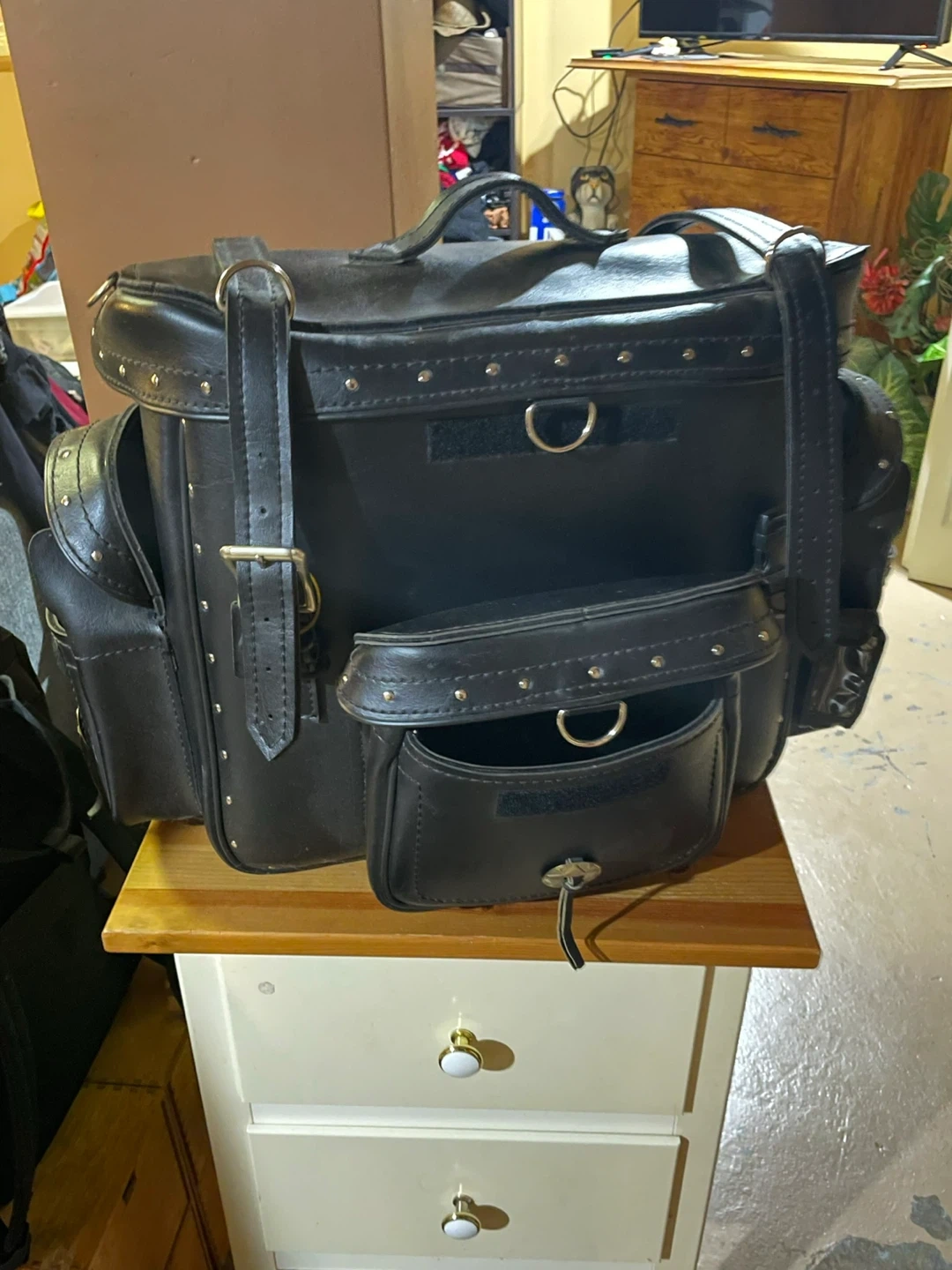 black leather motorcycle luggage with metal studs and adjustable straps. Waterproof with multiple pockets for storage. Great for carrying essentials on your bike!