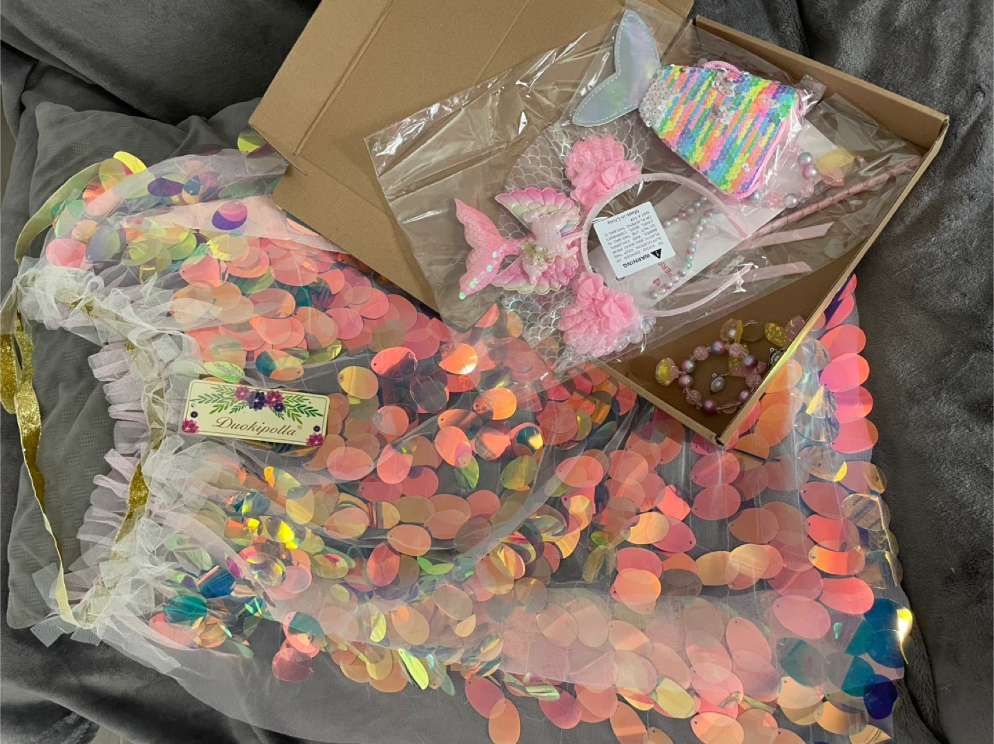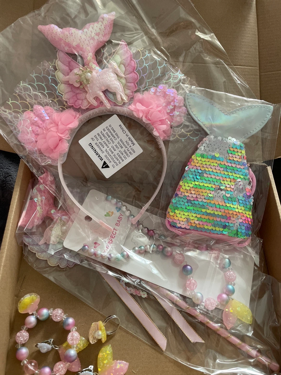 Costume set includes a sparkly mermaid tail skirt, a headband with ears and unicorn, and a matching coin purse, beaded bracelet, necklace, clip on earrings, a ring and a magic wand