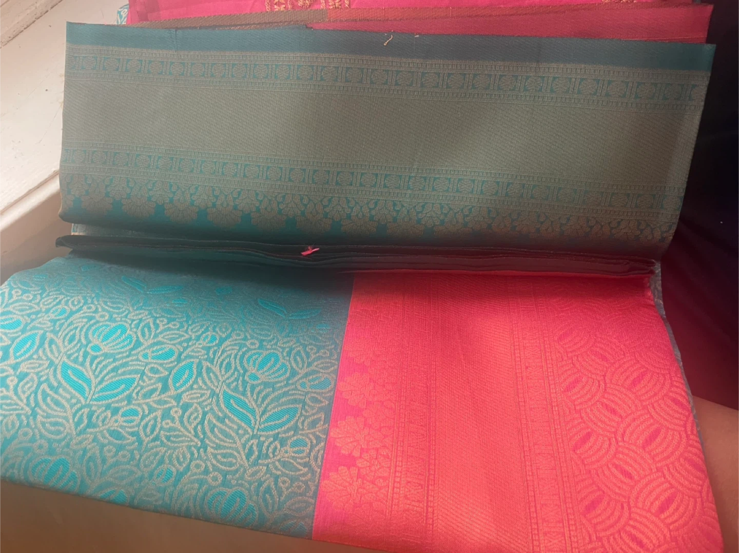 Beautiful silk sarees in a variety of colours and intricate patterns. Features include rich gold thread work and fringed edges on some. Fabric is silk with woven designs. Perfect for special occasions or traditional wear!