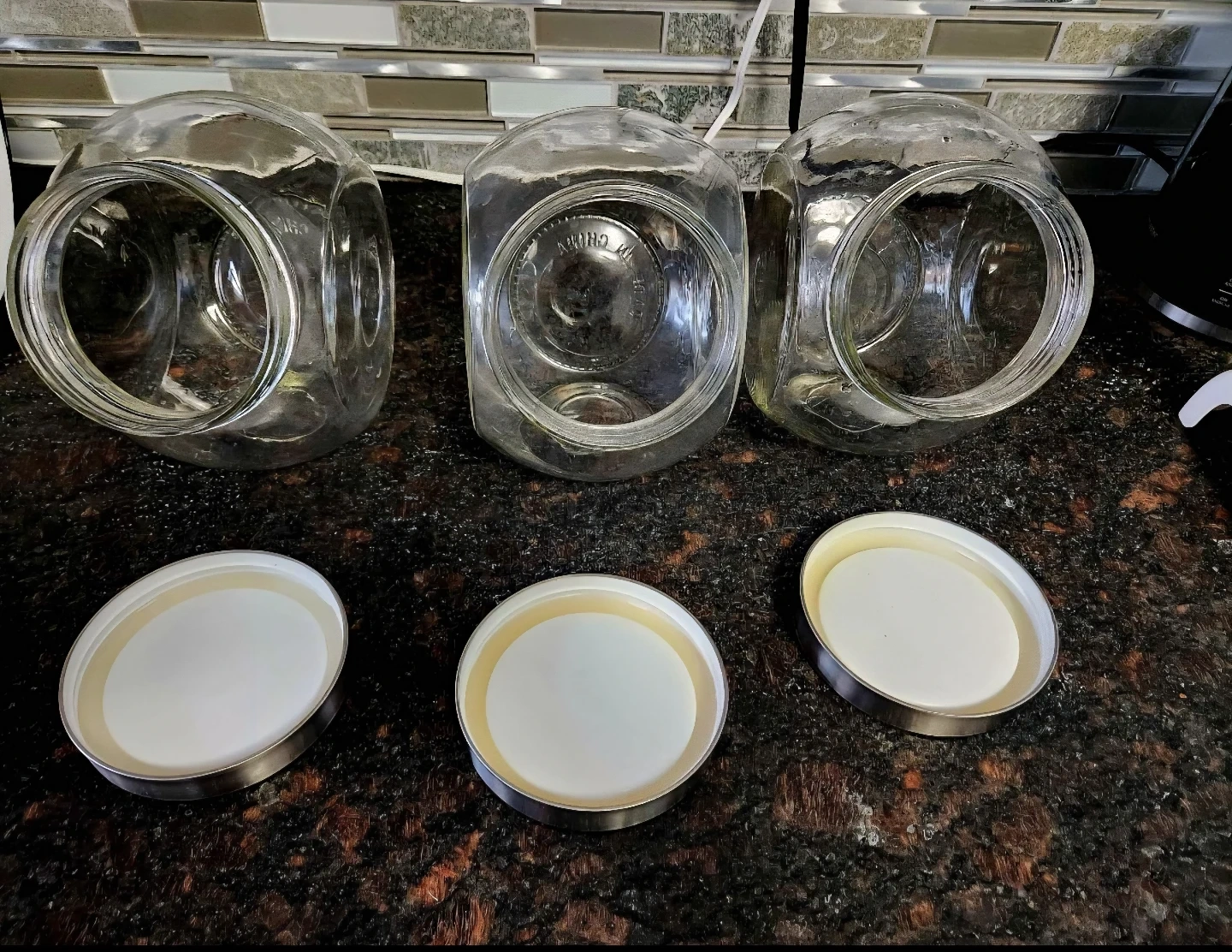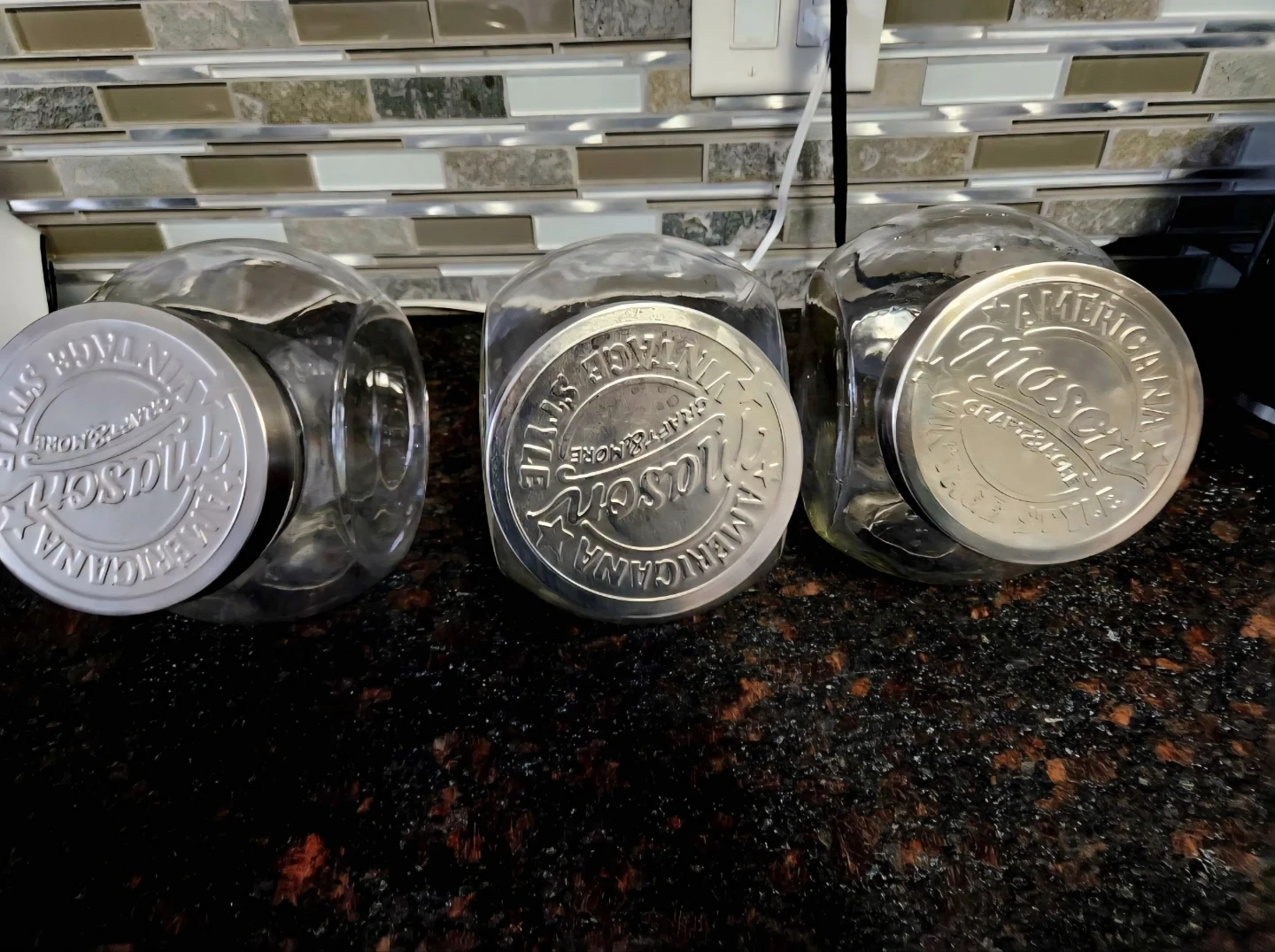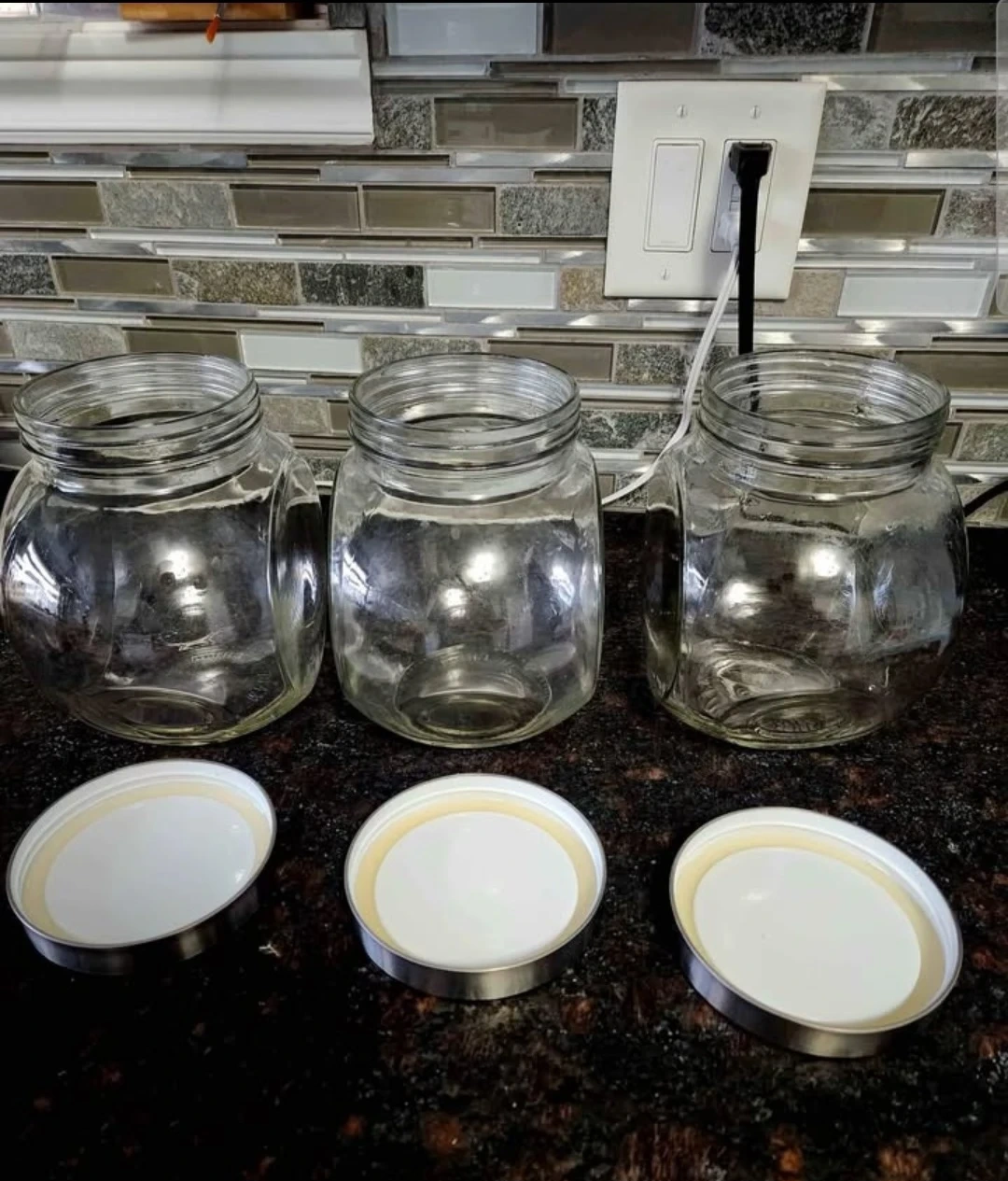 This is a set of three clear glass storage jars. They come with silver lids that have a white sealing insert. Perfect for storing dry goods or decorative items!