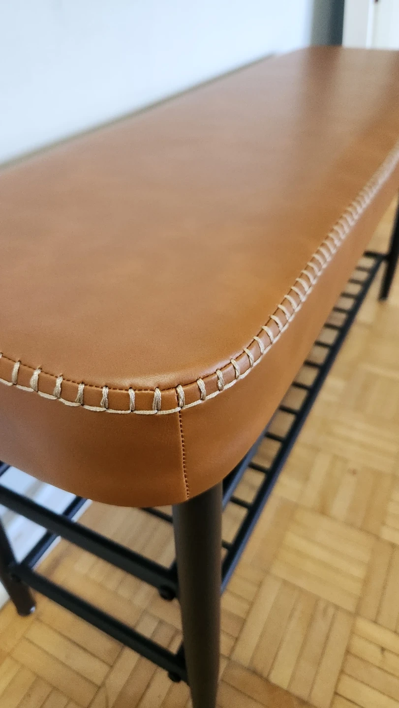 This padded brown bench is brand new, elegant, high quality, and comfortable - has a padded leather seat and 2 shelves for storage. It's useful to put in the entryway, living room, or bedroom. It's brand new and still in box. I can assemble for extra $5 deposited in advance. The original price was $373+ with tax without assembly fee yet (save $$ and time), so price is not negotiable. See dimensions and other features in the pictures.