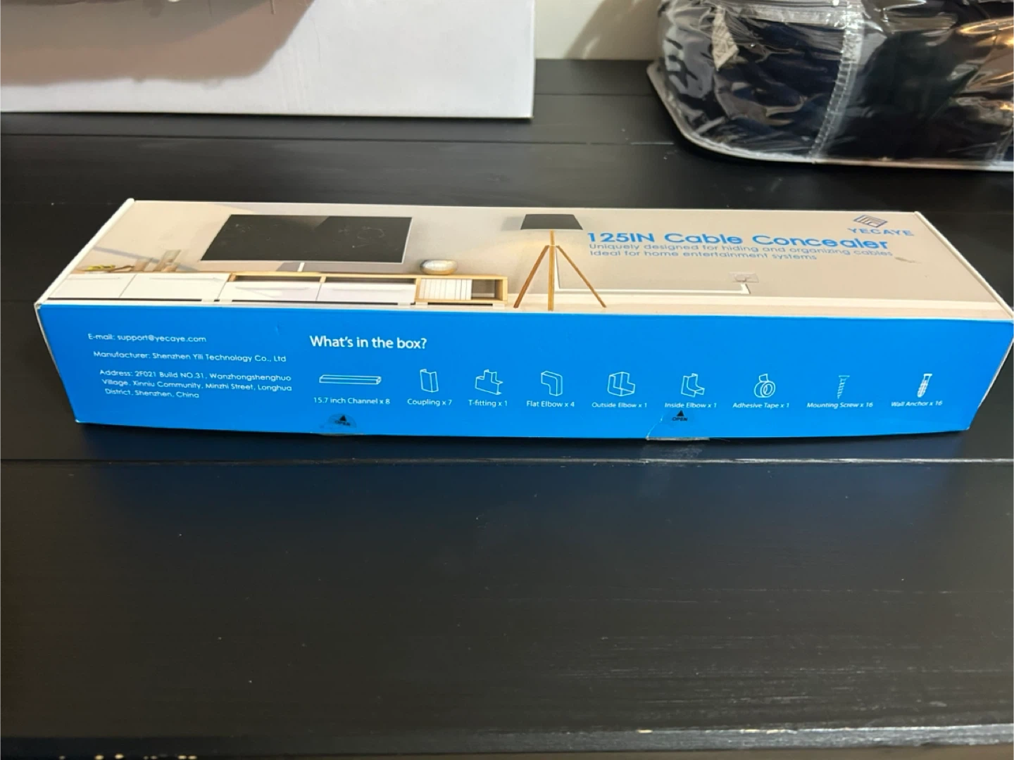 This is a YECAYE 125in cable concealer kit. It includes 13.7 inch channels, 7 couplings, 1 T-fitting, 4 flat elbows, 1 outside elbow, 1 inside elbow, adhesive tape, and 16 mounting screws. It's designed for tidying and organizing cables, making it ideal for home entertainment systems. White colour.