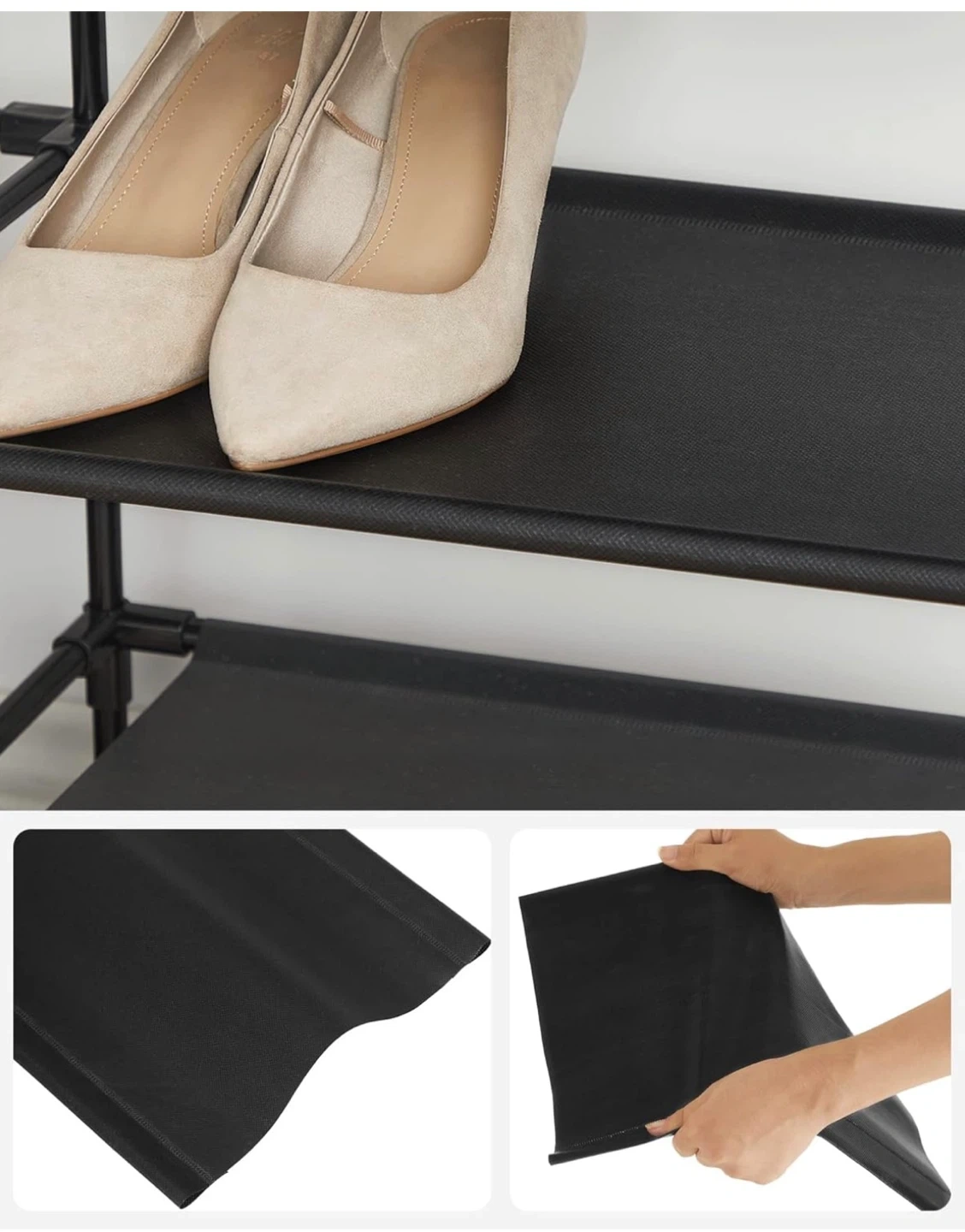 This 7-tier shoe rack holds lots of footwear! It's made of sturdy metal with black fabric shelves. It's great for keeping your entryway or closet tidy