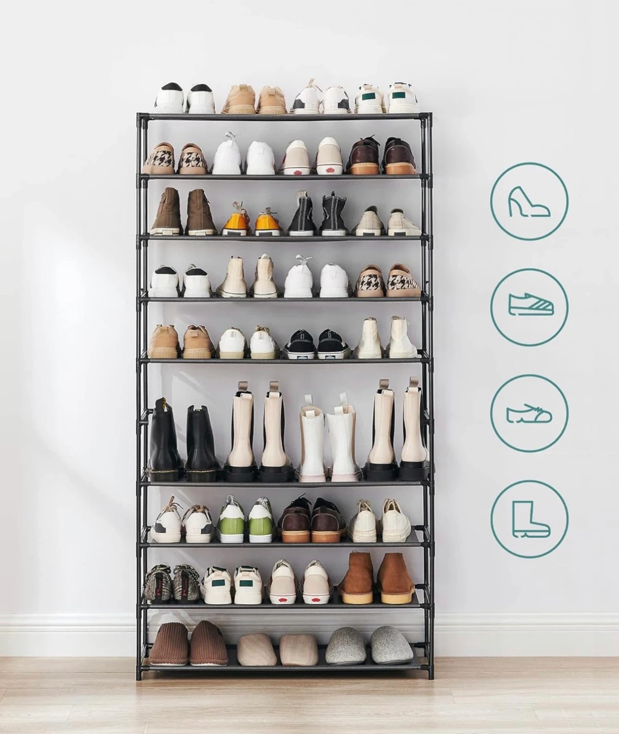 This 7-tier shoe rack holds lots of footwear! It's made of sturdy metal with black fabric shelves. It's great for keeping your entryway or closet tidy