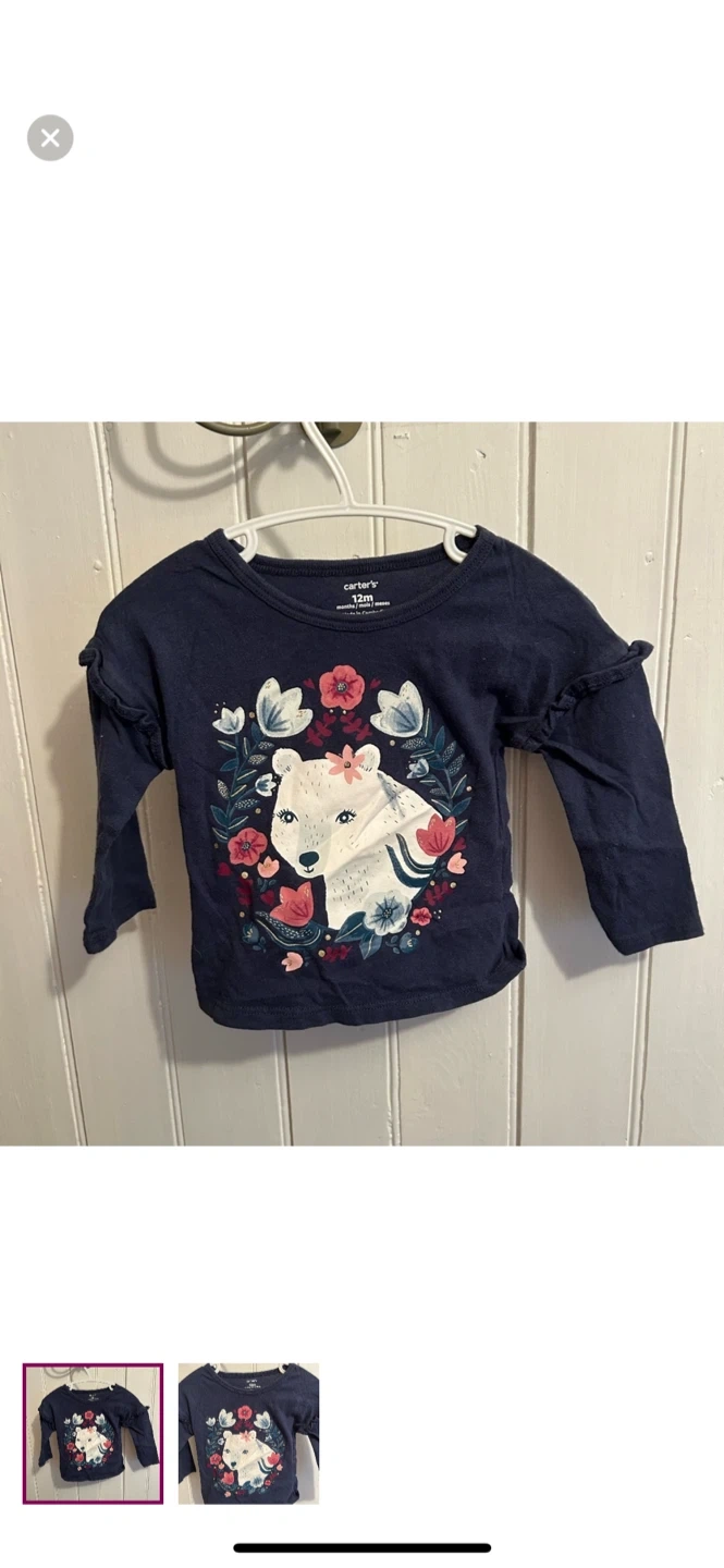 Carters brand. Long sleeve top. Navy with white bear and pink & blue floral graphic. Size 12m. Brand new condition