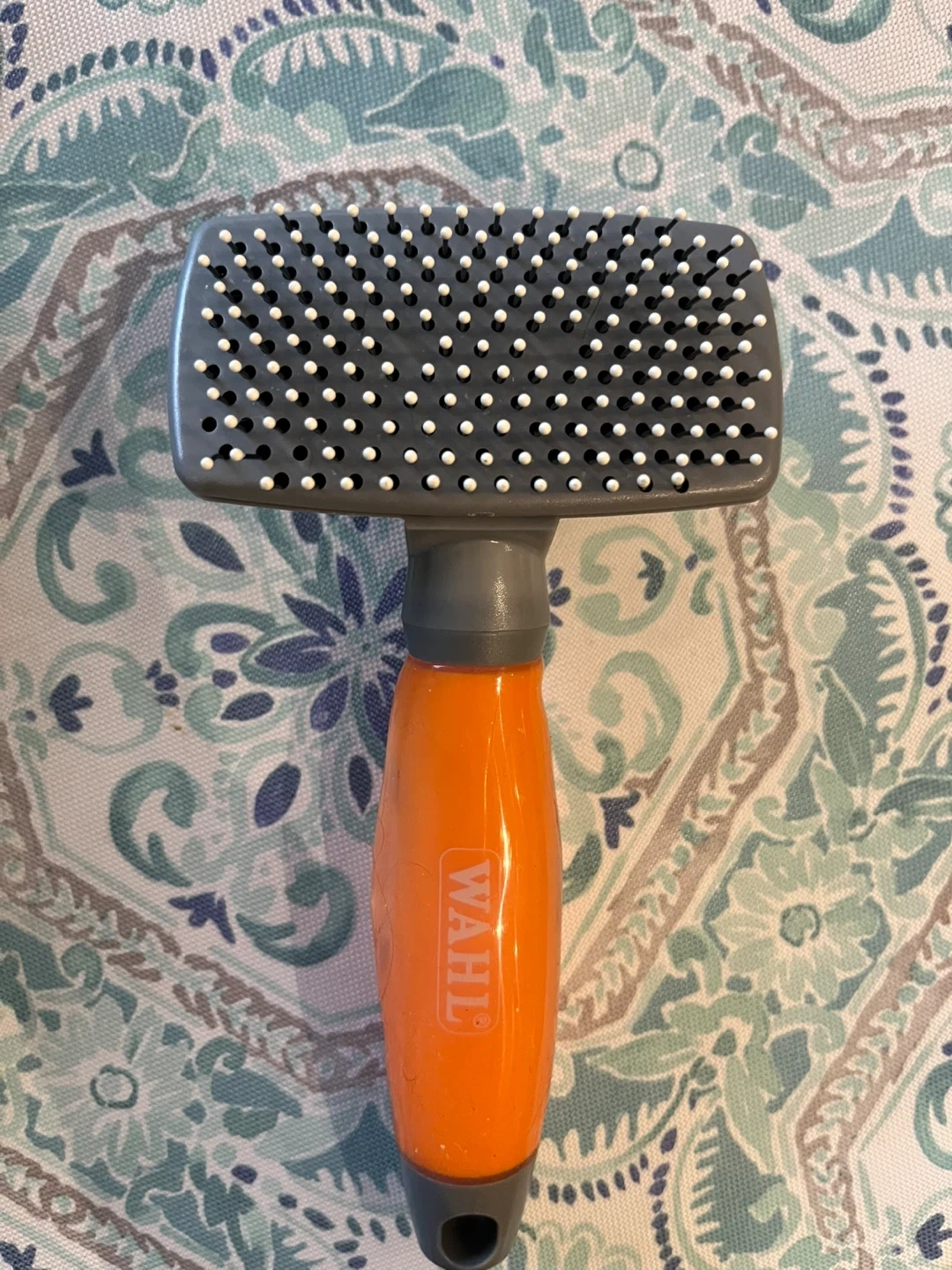 Wahl slicker brush for pets. Features an orange handle for a comfortable grip. The bristles are designed to effectively remove loose fur. bought two by mistake