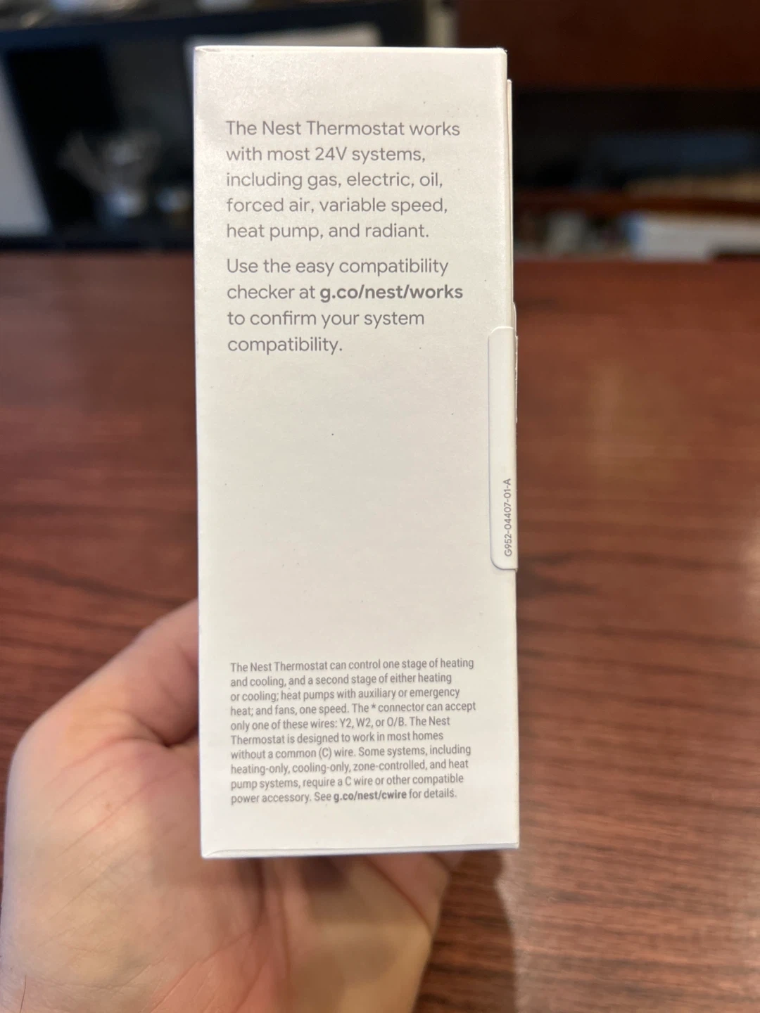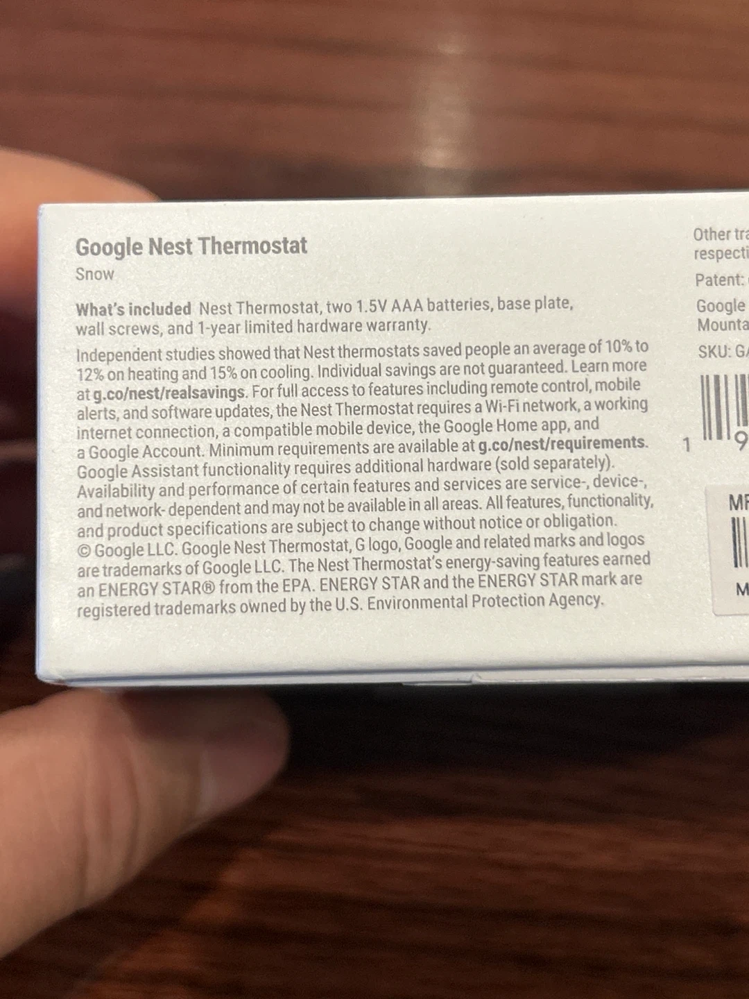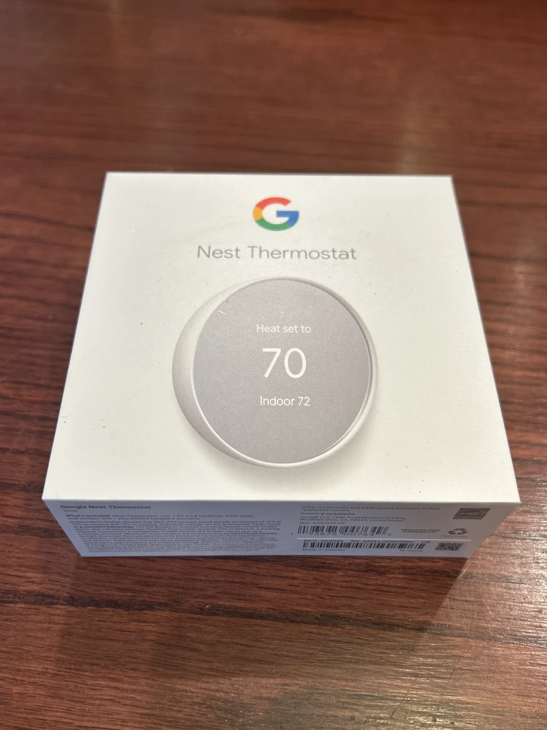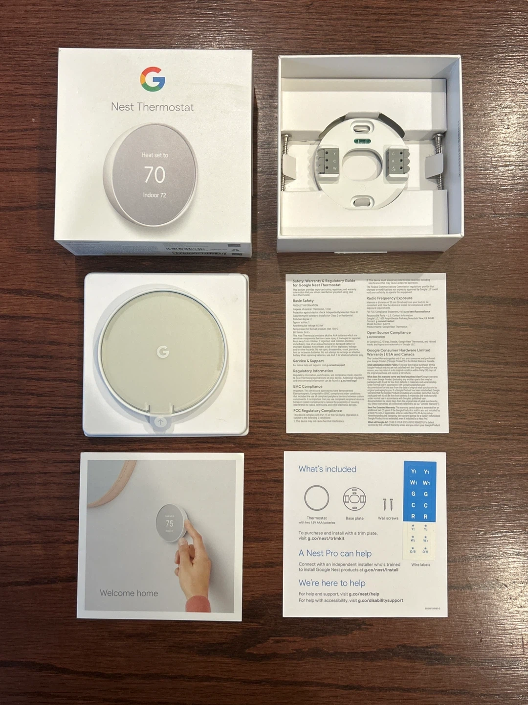 Selling a new but opened Google Nest Thermostat in Snow color. Item was incompatible with our system. It comes with two 1.5V AAA batteries, a base plate, wall screws, and a one-year limited hardware warranty. The Nest Thermostat works with most 24V systems, including gas, electric, oil, forced air, variable speed, heat pump, and radiant. It is designed to work in most homes without a common (c) wire in some systems. The box is included.