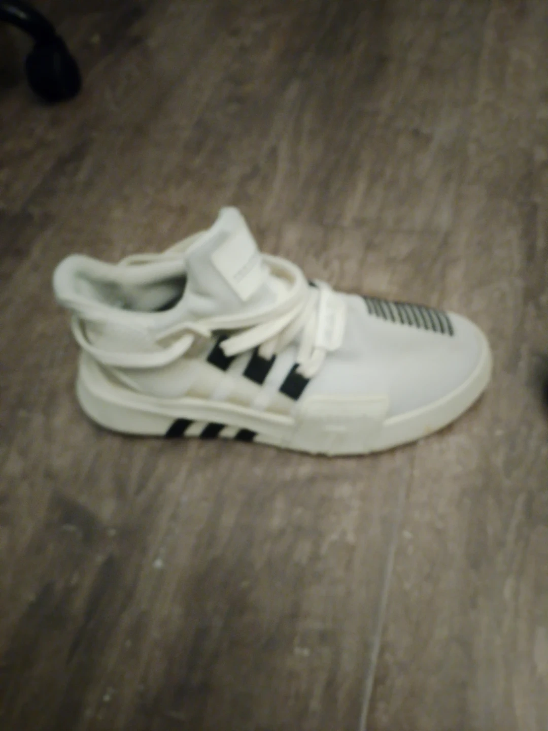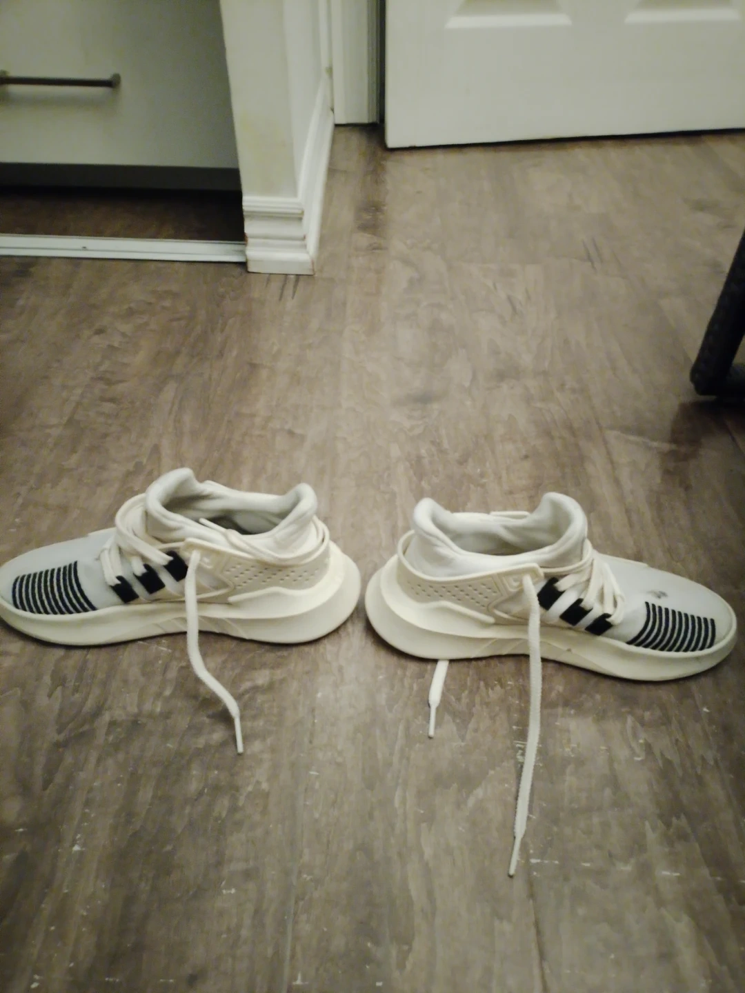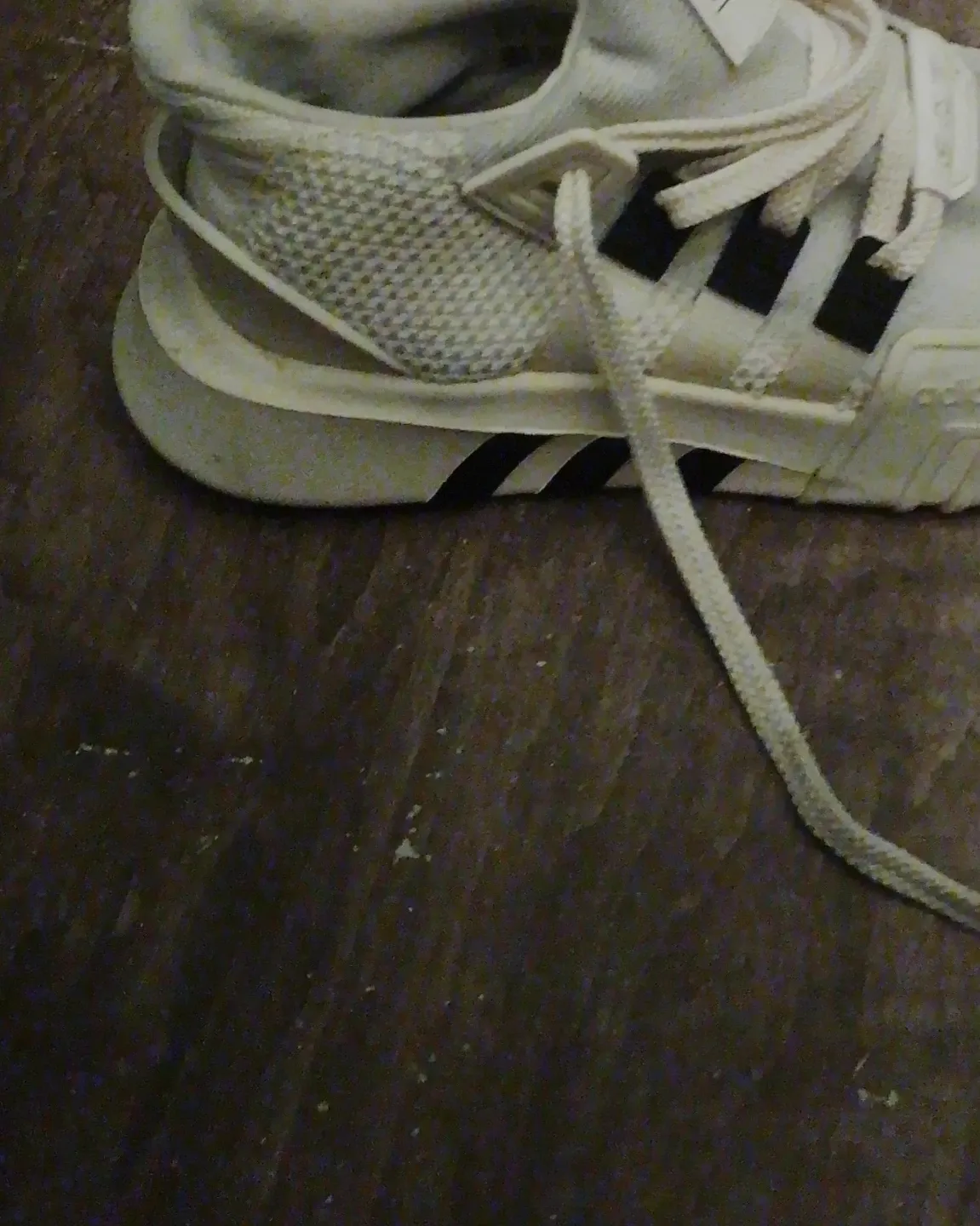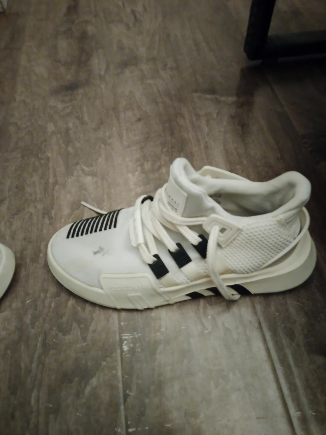 These are a pair of white Adidas EQT sneakers. They feature black Adidas stripes and a mesh accent on the heel. Suitable for everyday wear.