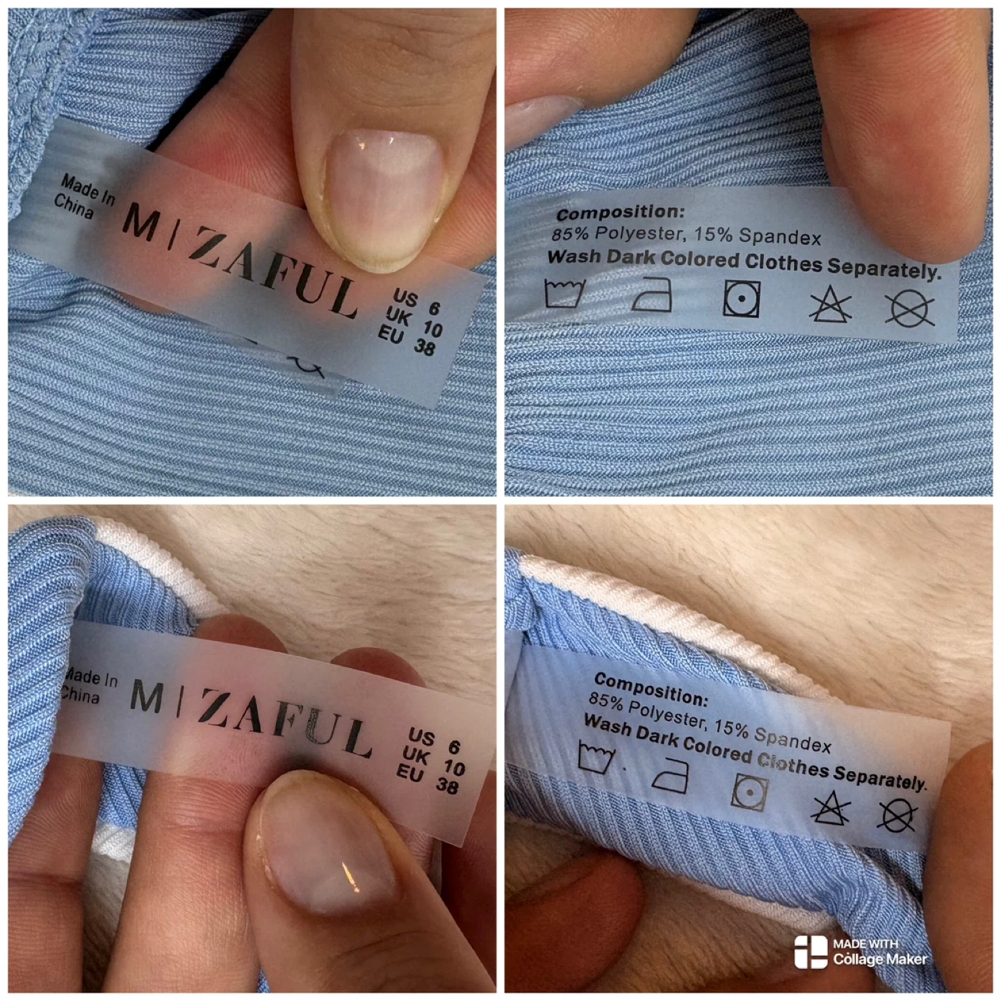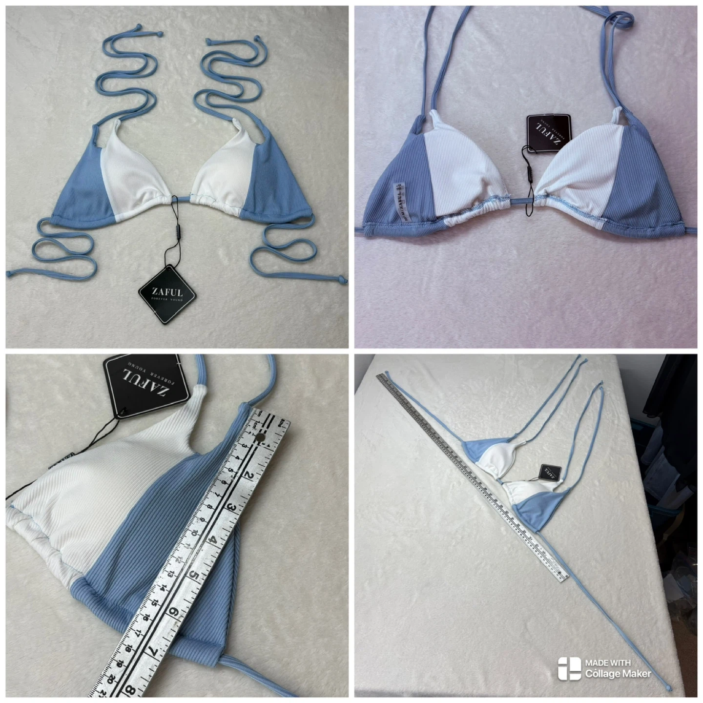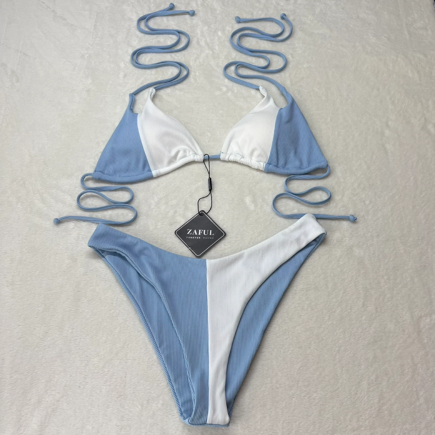 This Zaful bikini features a modern color block design in blue and white with a textured ribbed material. The top is a versatile sliding triangle style featuring trendy double straps at the neck for extra detail. The matching bottoms offer a flattering high-rise and high-cut silhouette.