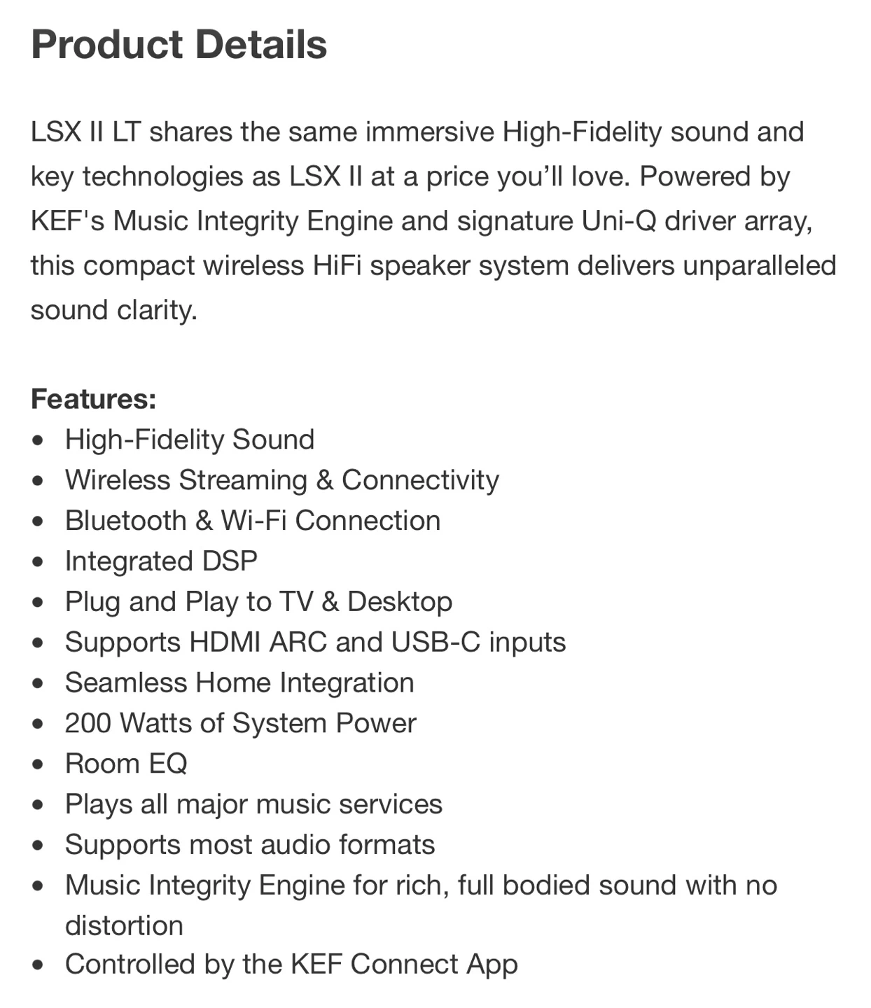 Experience immersive High-Fidelity sound with this compact wireless HiFi speaker system. It features KEF's Music Integrity Engine and Uni-Q driver array for unparalleled sound clarity. Supports HDMI ARC, USB-C, and Bluetooth connectivity, with 200 Watts of system power and Room EQ. These speakers are great for music lovers who want premium audio at home!