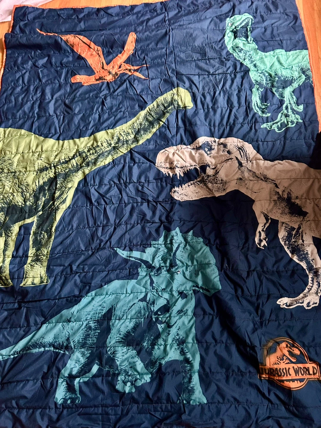 Here's a gently used Jurassic World comforter featuring various dinosaurs like a T-Rex, Triceratops, and Pterodactyl! It's in great condition and ready to keep someone warm and cozy!