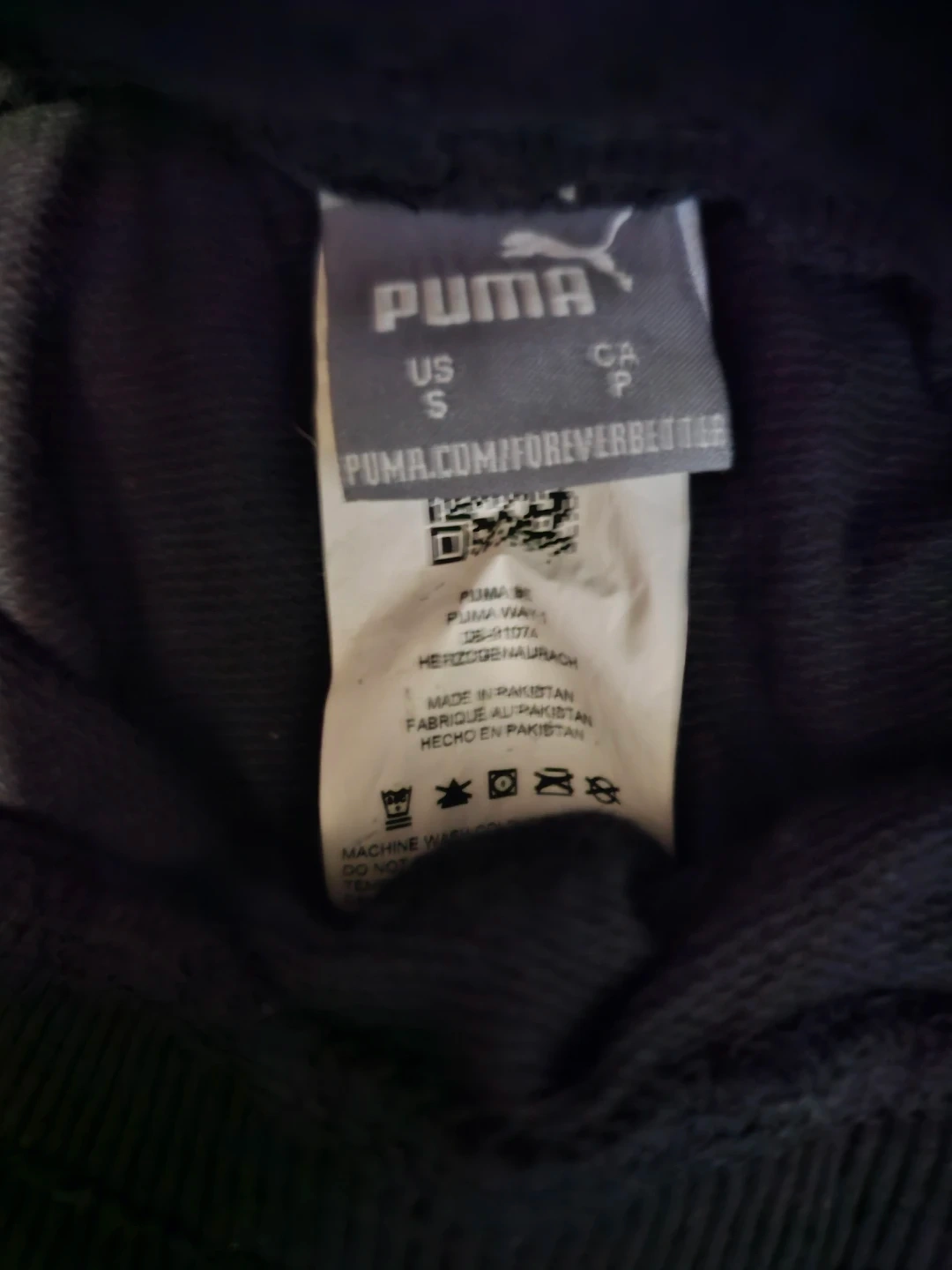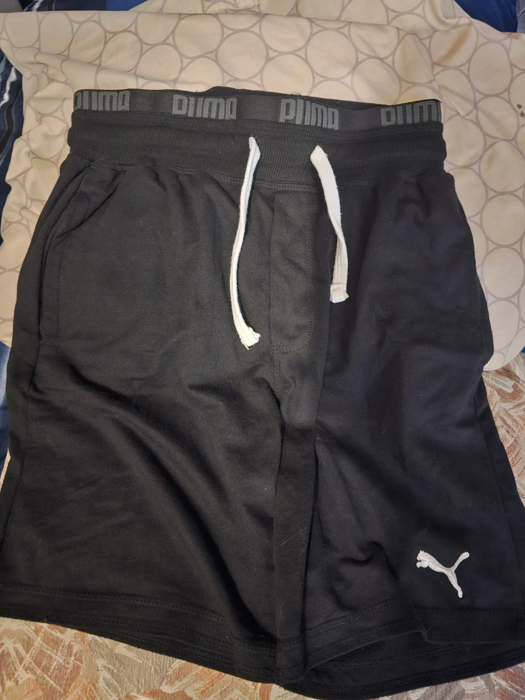 These are black Puma athletic shorts with a drawstring waist and pockets. They're made from a soft, breathable material. Size is small, US/CA S.
