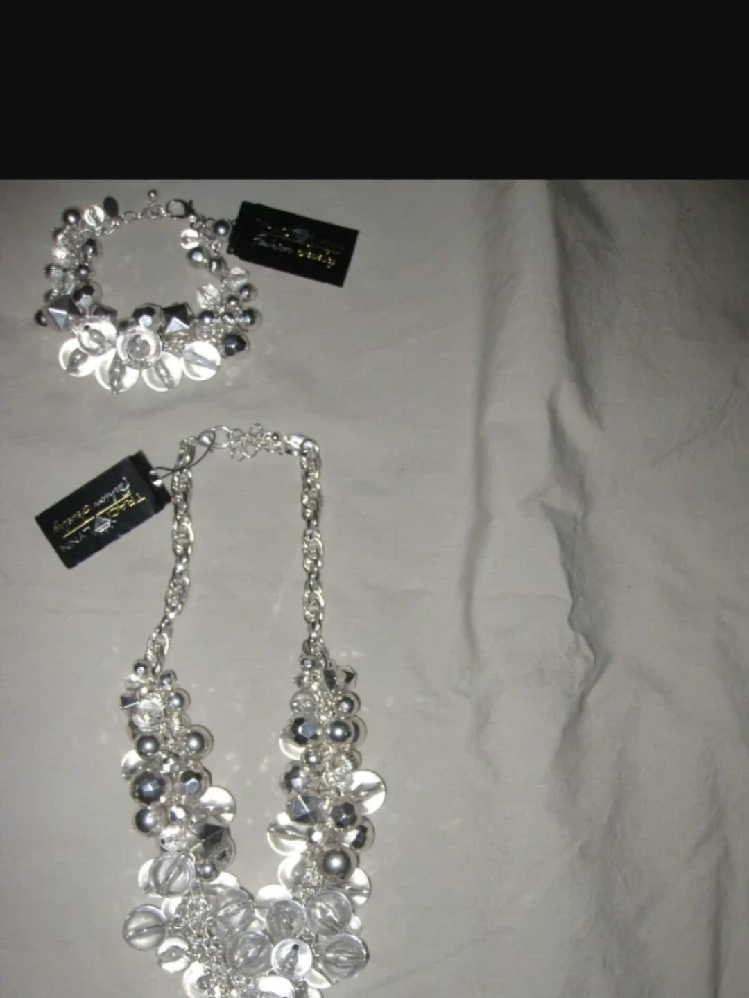 2 piece set. Brand new women's necklace with black tag and matching bracelet. Jewelry has a large grapes design along with silver balls and cubes. Clear with silver charms. Firmly priced. See ALL pics.