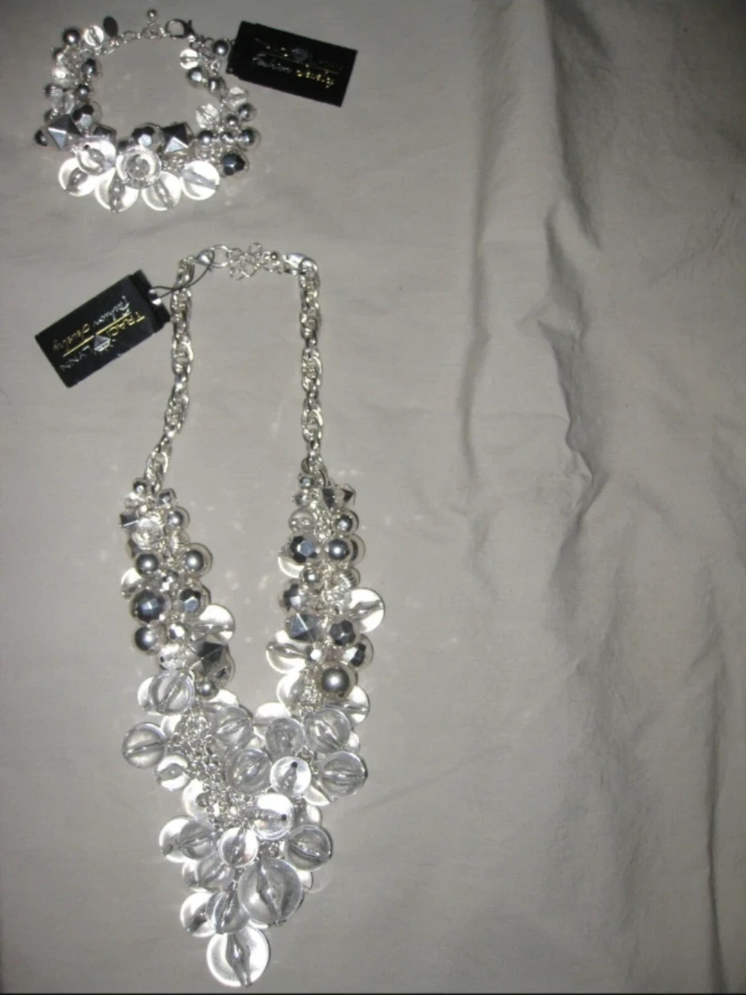 2 piece set. Brand new women's necklace with black tag and matching bracelet. Jewelry has a large grapes design along with silver balls and cubes. Clear with silver charms. Firmly priced. See ALL pics.