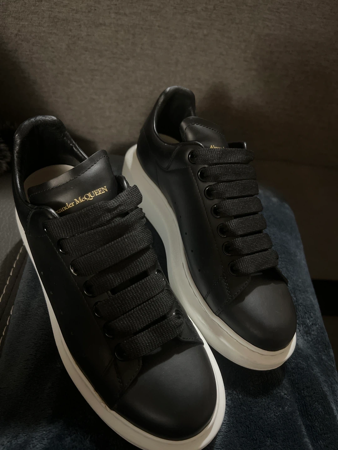 Alexander McQueen oversized sneakers in black leather. Features a white rubber sole. These are stylish and comfortable for everyday wear. Size 37