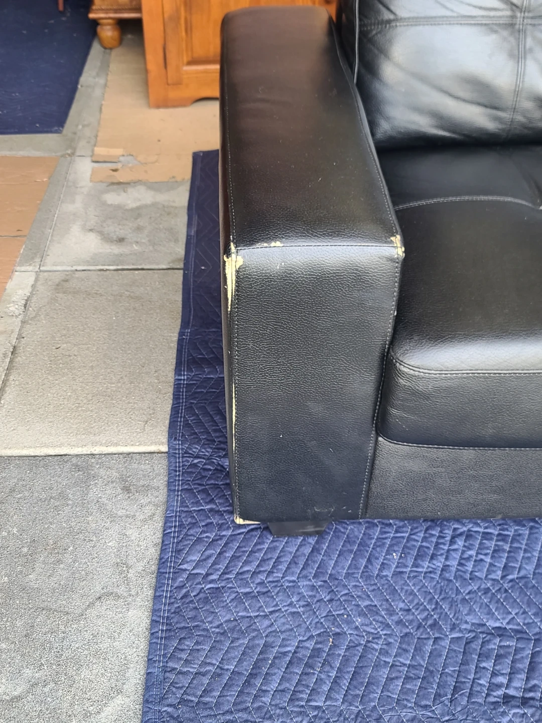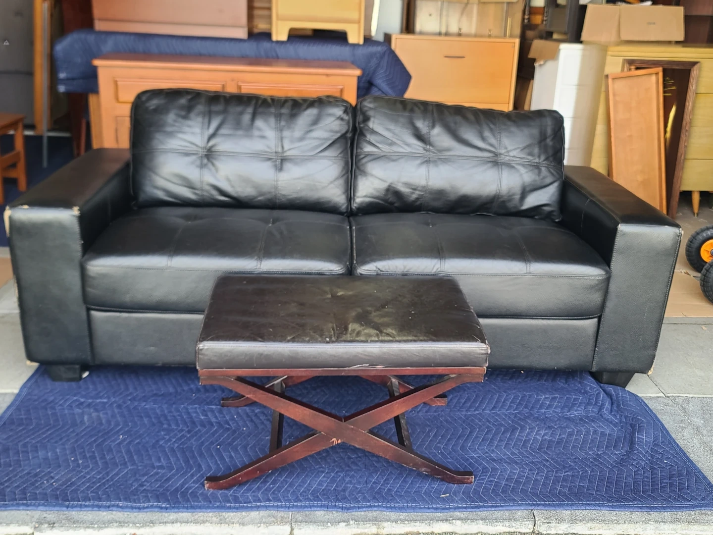 Black faux leather loveseat with button-tufted back cushions. Some wear visible on the armrests, as shown. Includes a matching ottoman. Measurements to follow. Delivery can be arranged. Viewing and pickup by appointment.