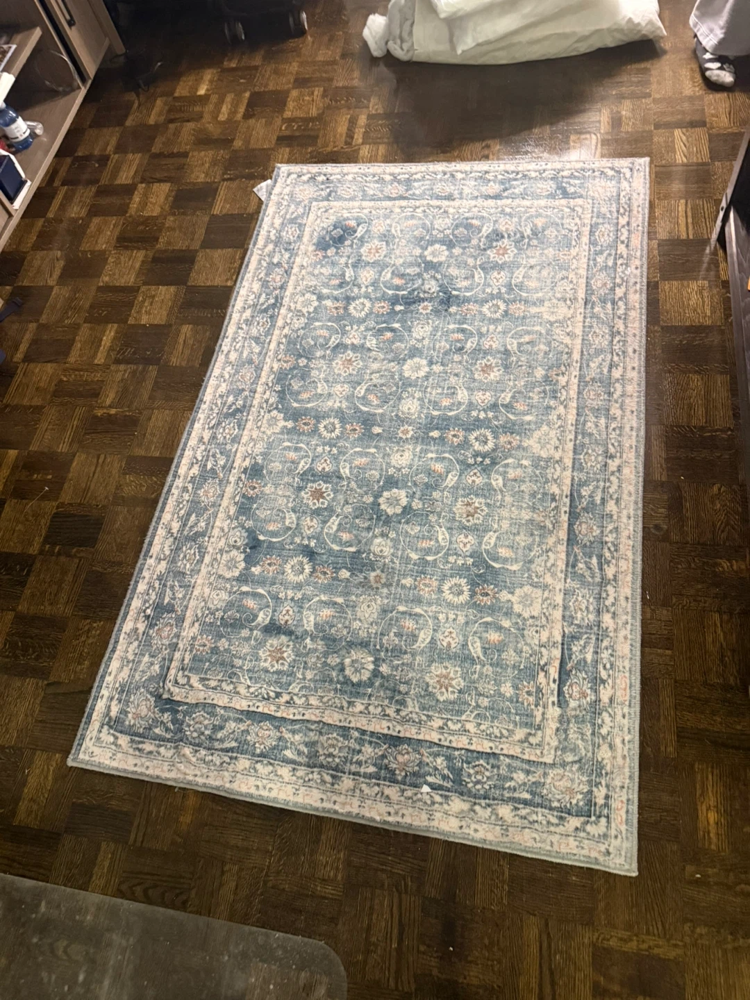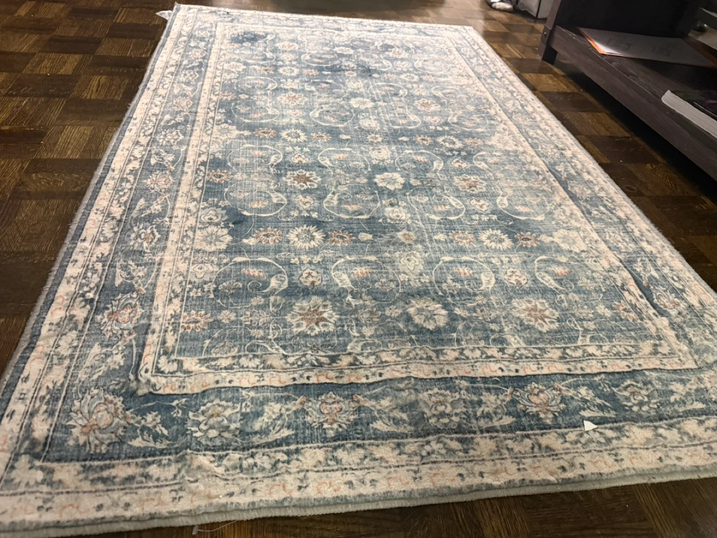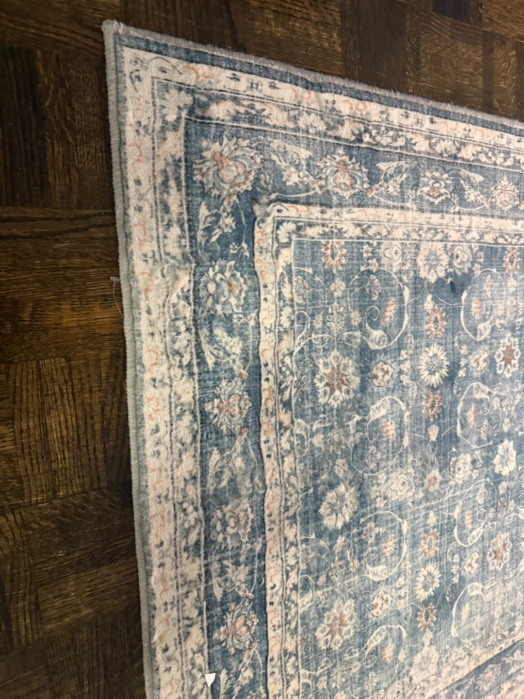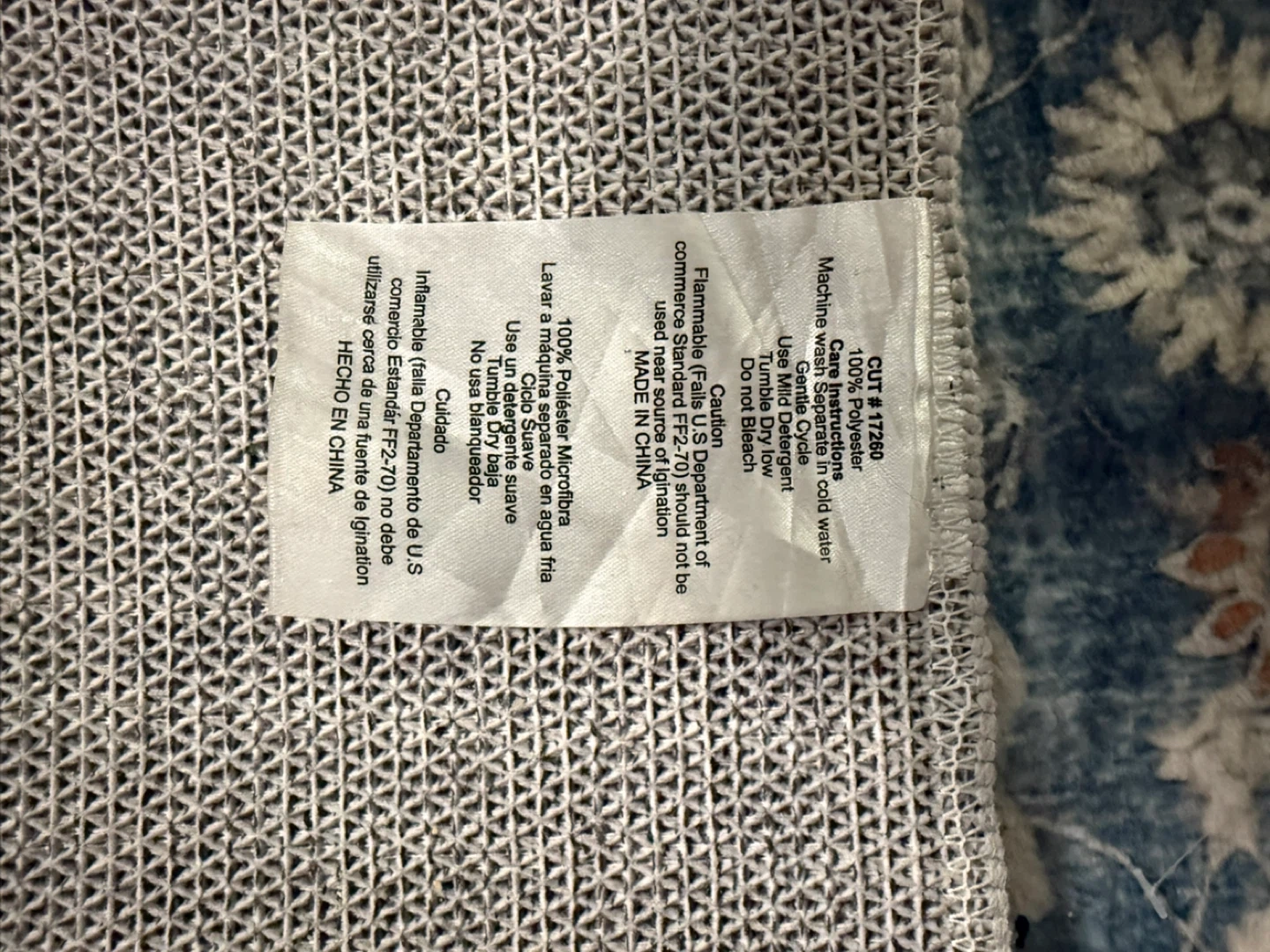 This is a beautiful blue area rug with an oriental design. It's made from 100% polyester microfiber. Machine wash cold water, gentle cycle.