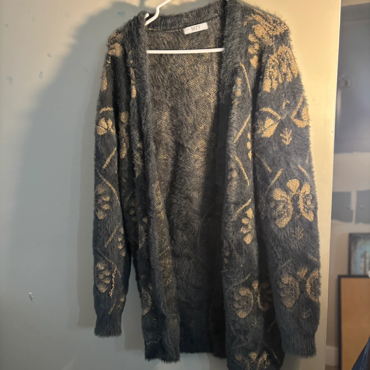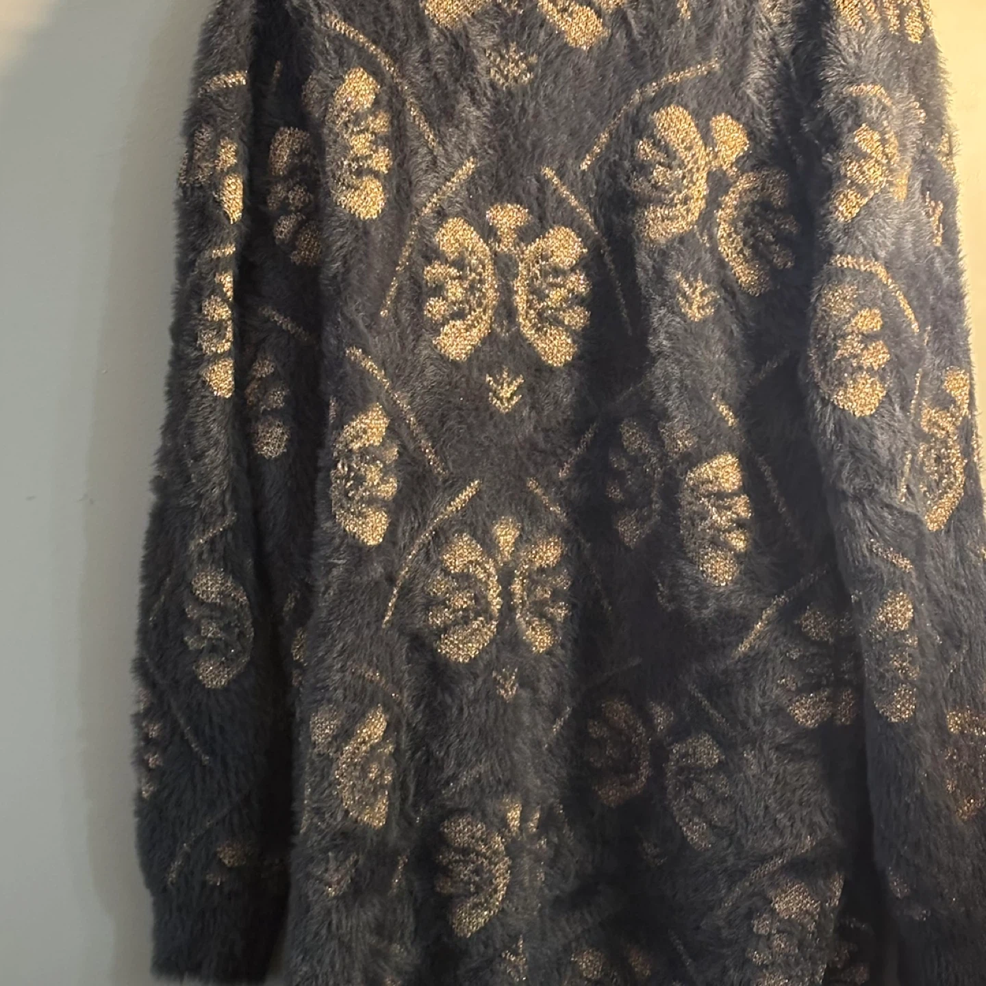Cozy fuzzy cardigan with a metallic gold floral pattern. Size L/G. Made in Bangladesh. Pick up in Terwillegar