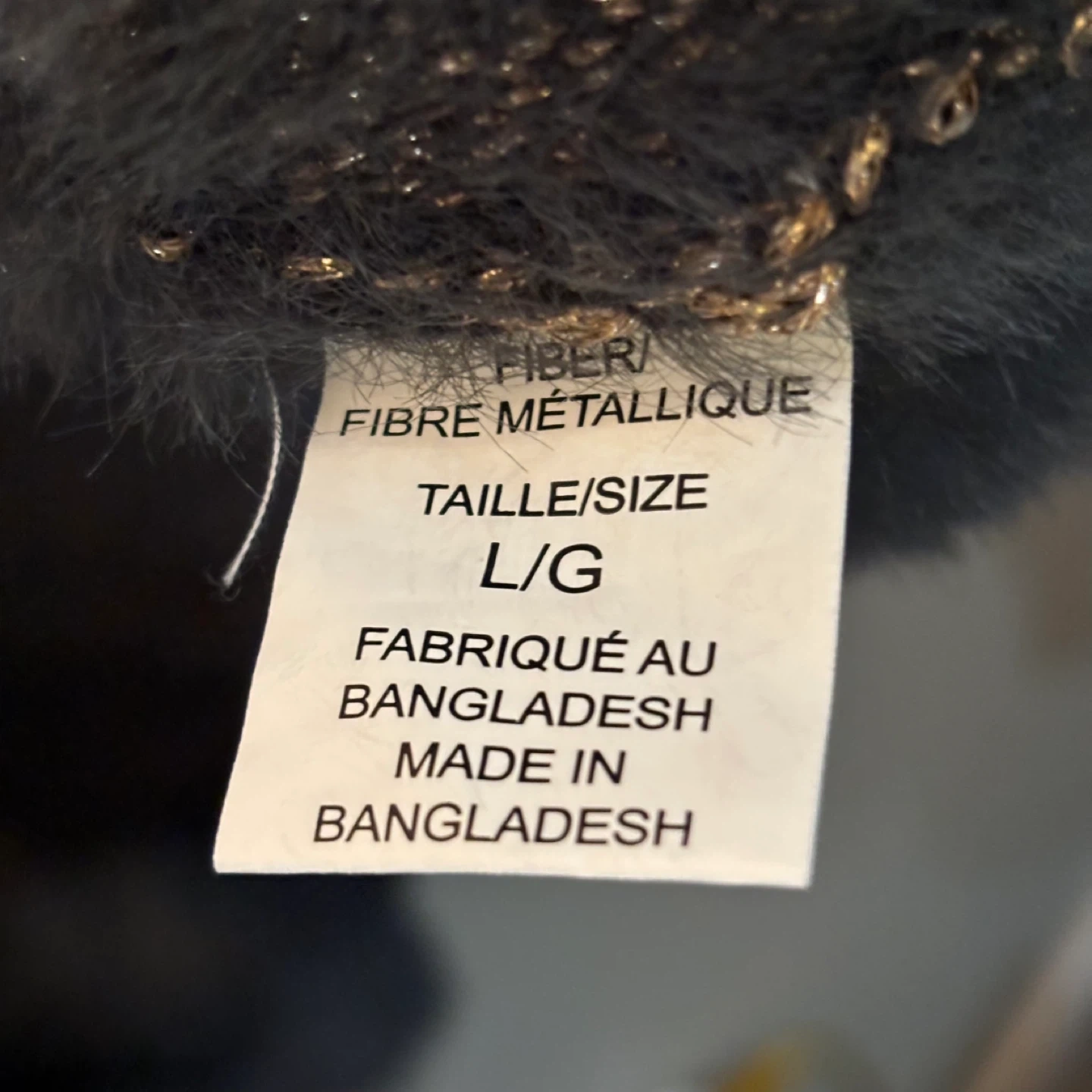 Cozy fuzzy cardigan with a metallic gold floral pattern. Size L/G. Made in Bangladesh. Pick up in Terwillegar