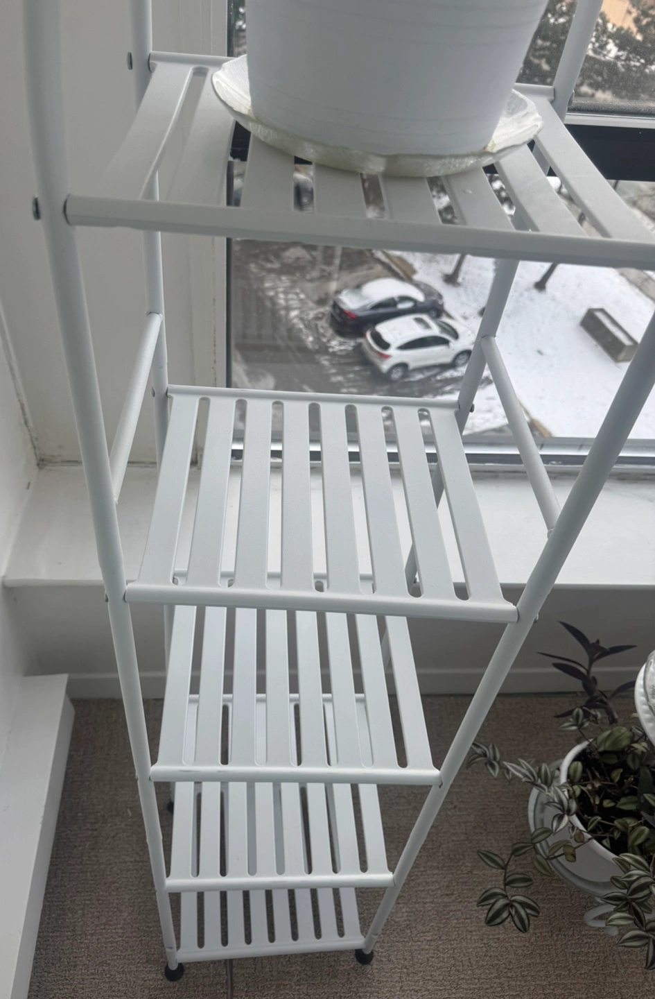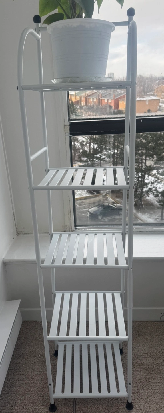 Slim metal shelving unit. Five shelves. White finish. Great for plants or storage. Sturdy construction. Good condition.
