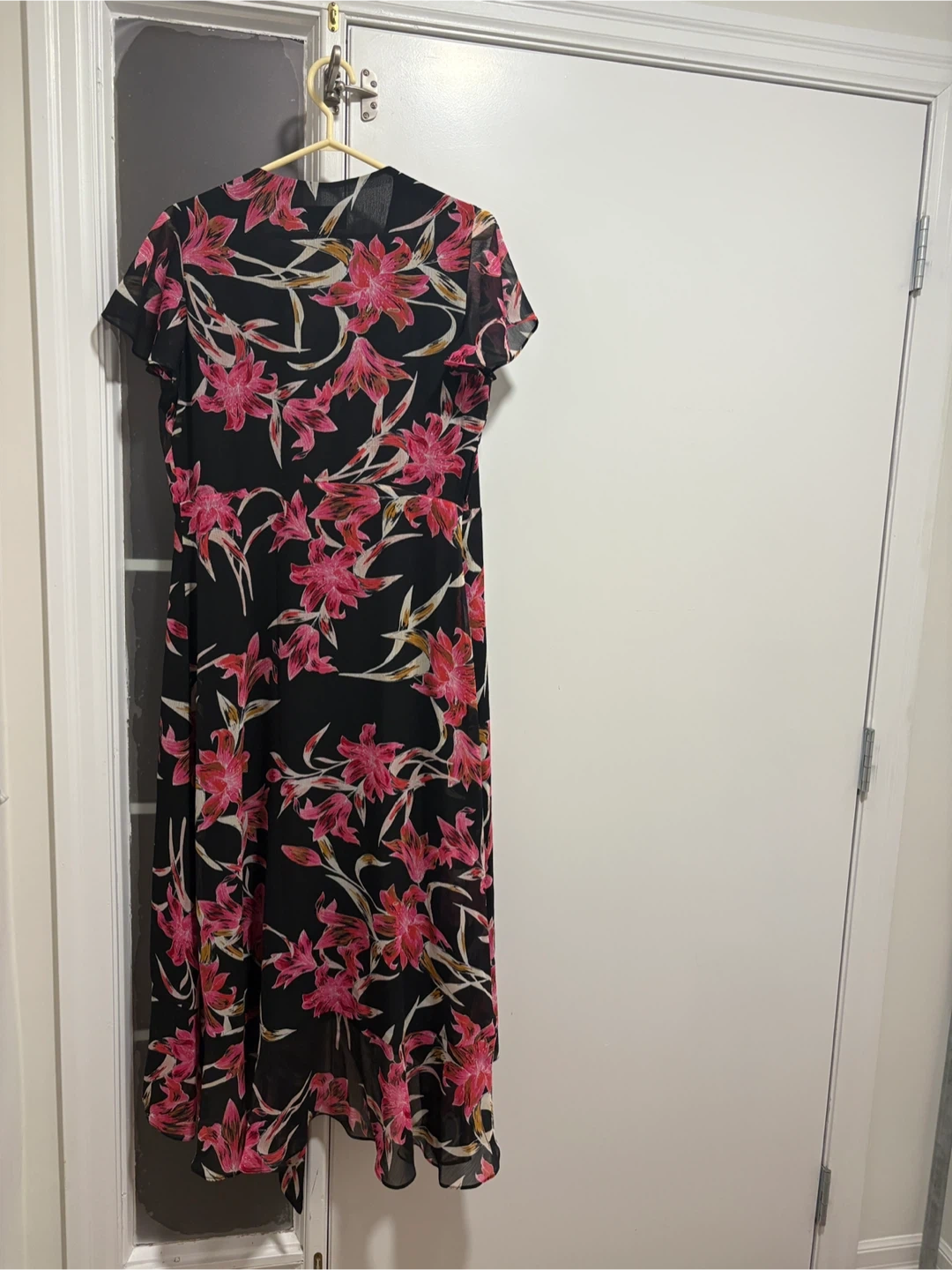 This beautiful Joseph Ribkoff dress comes in black with a vibrant pink lily pattern and is designed in wrap style with a V-neckline, short frill sleeves, a sash tie with ring fastener at the waist and a ruffled hemline. Made from a lightweight chiffon fabric with black liner.