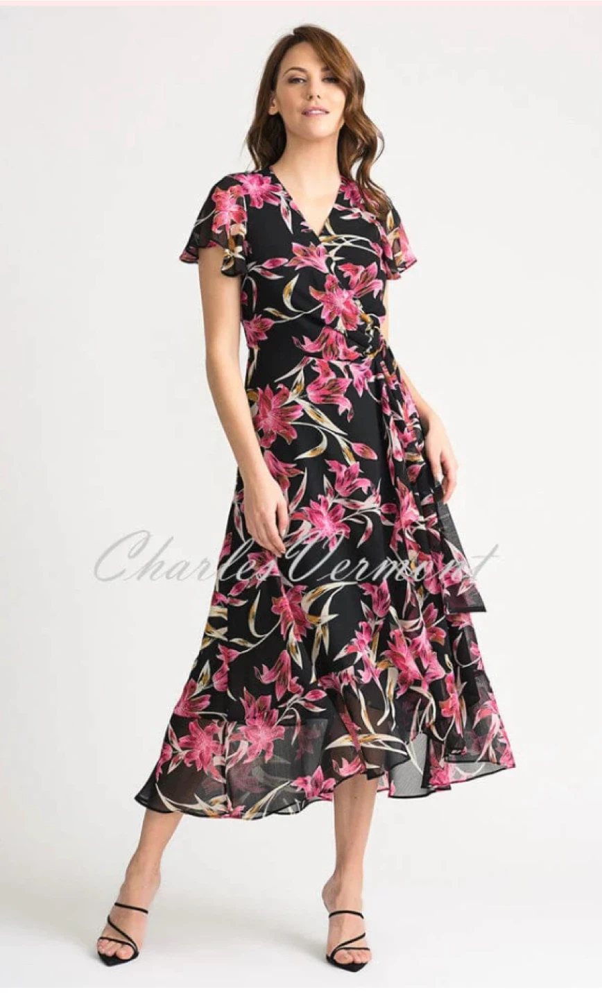 This beautiful Joseph Ribkoff dress comes in black with a vibrant pink lily pattern and is designed in wrap style with a V-neckline, short frill sleeves, a sash tie with ring fastener at the waist and a ruffled hemline. Made from a lightweight chiffon fabric with black liner.