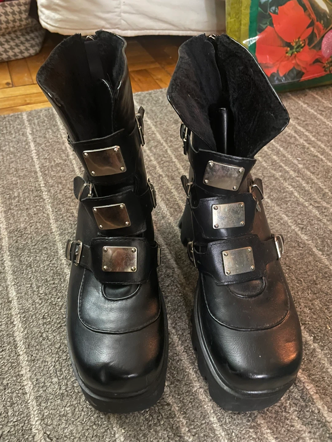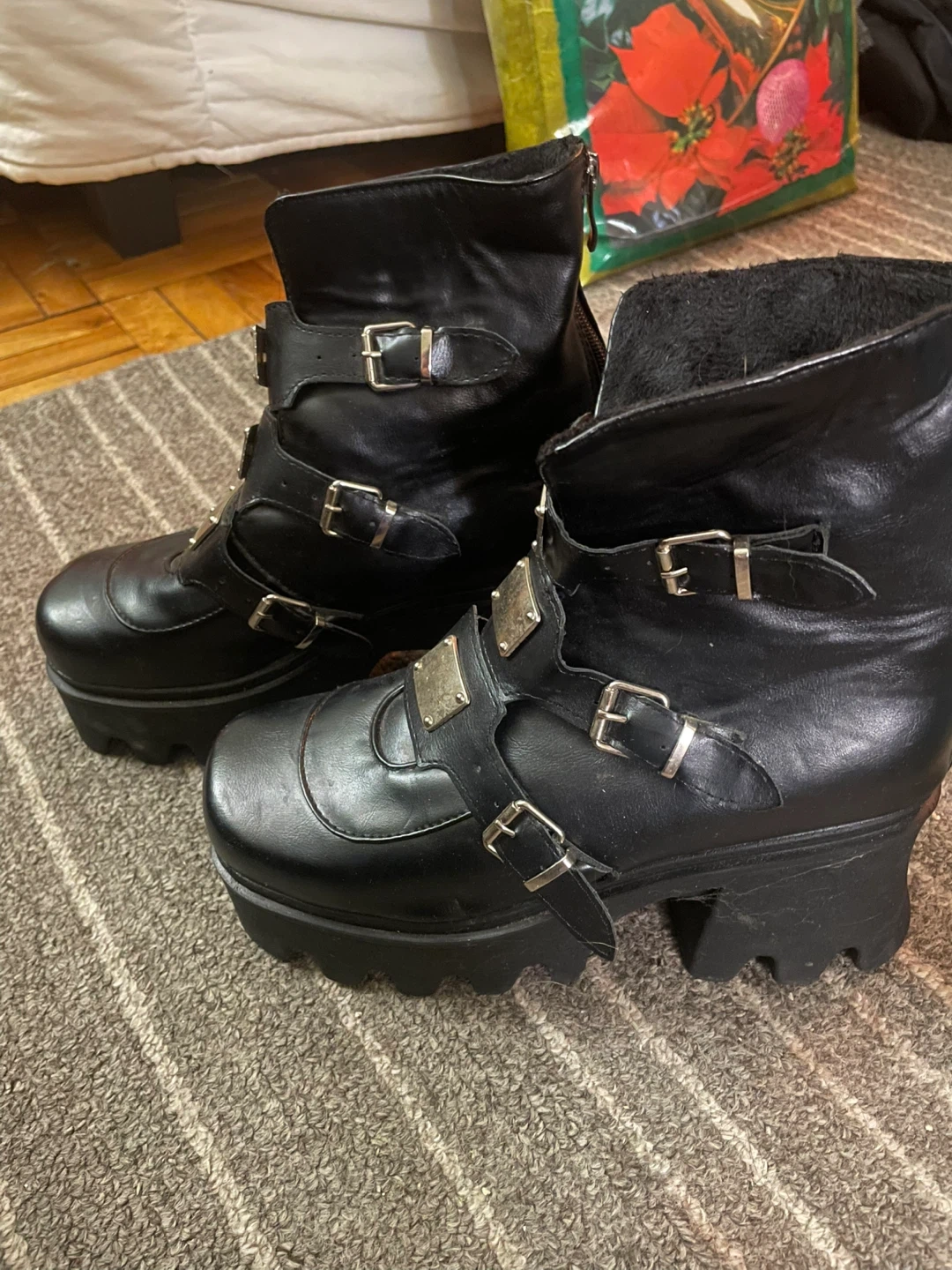 These are a pair of black platform ankle boots featuring multiple buckle straps and a chunky heel. They have a unique and stylish design, perfect for adding an edgy touch to any outfit. The boots are in great condition and ready for a new home!