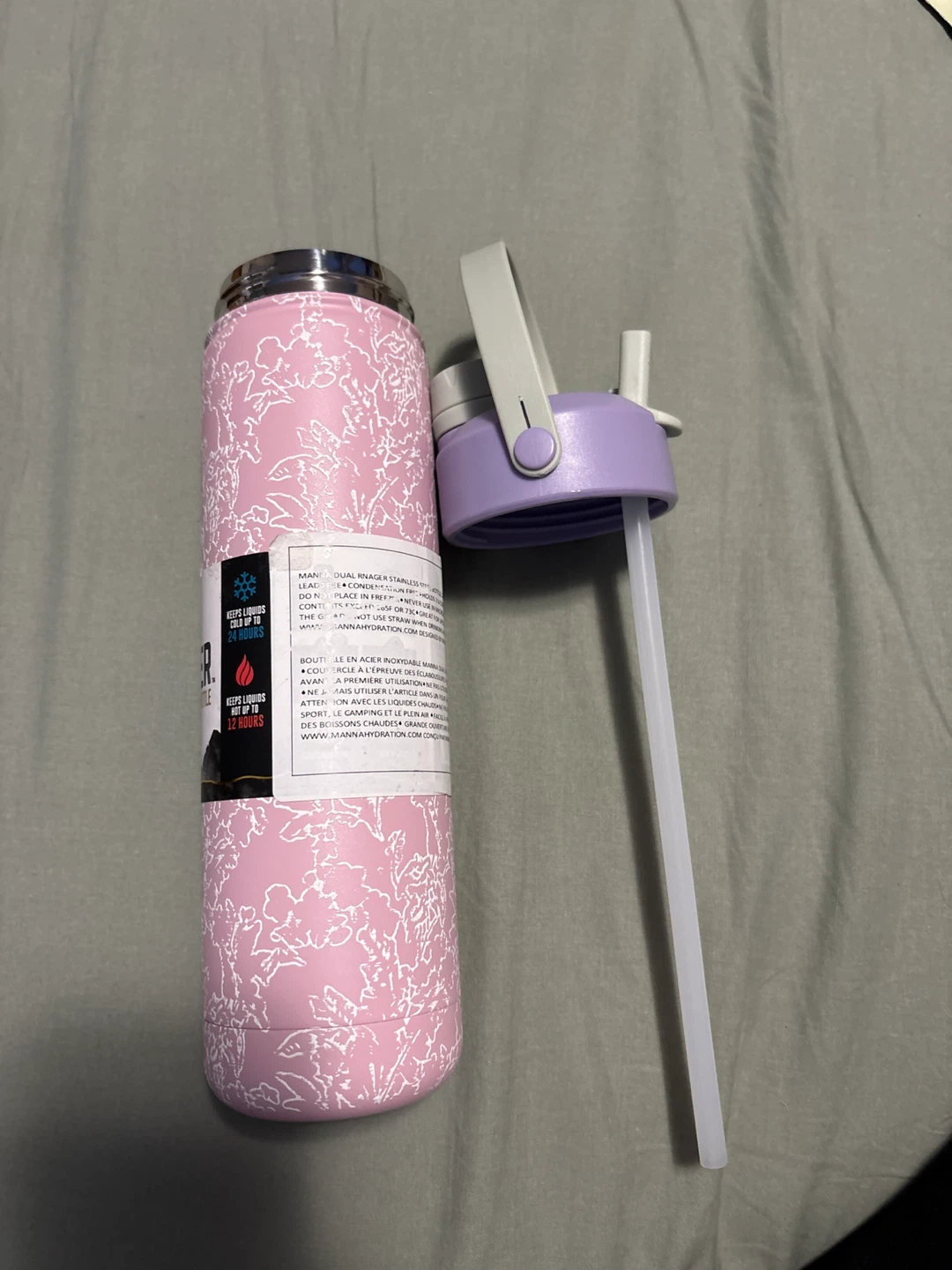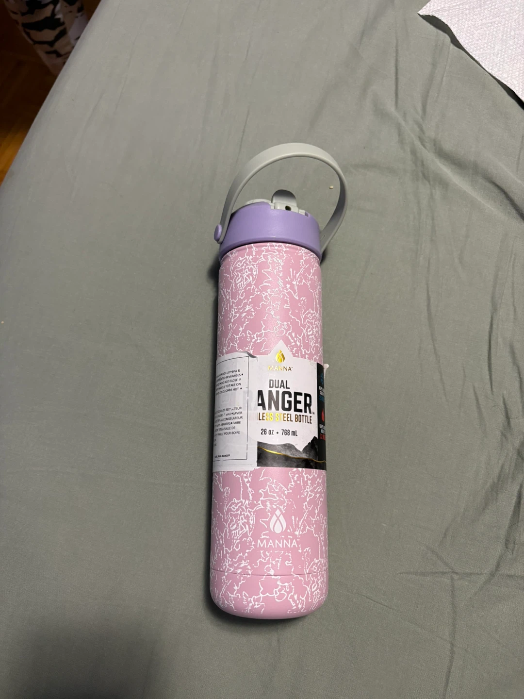This is a Manna Dual Anger stainless steel water bottle in a pink floral pattern. It's 26 oz or 768 mL. Keeps drinks cold or hot!