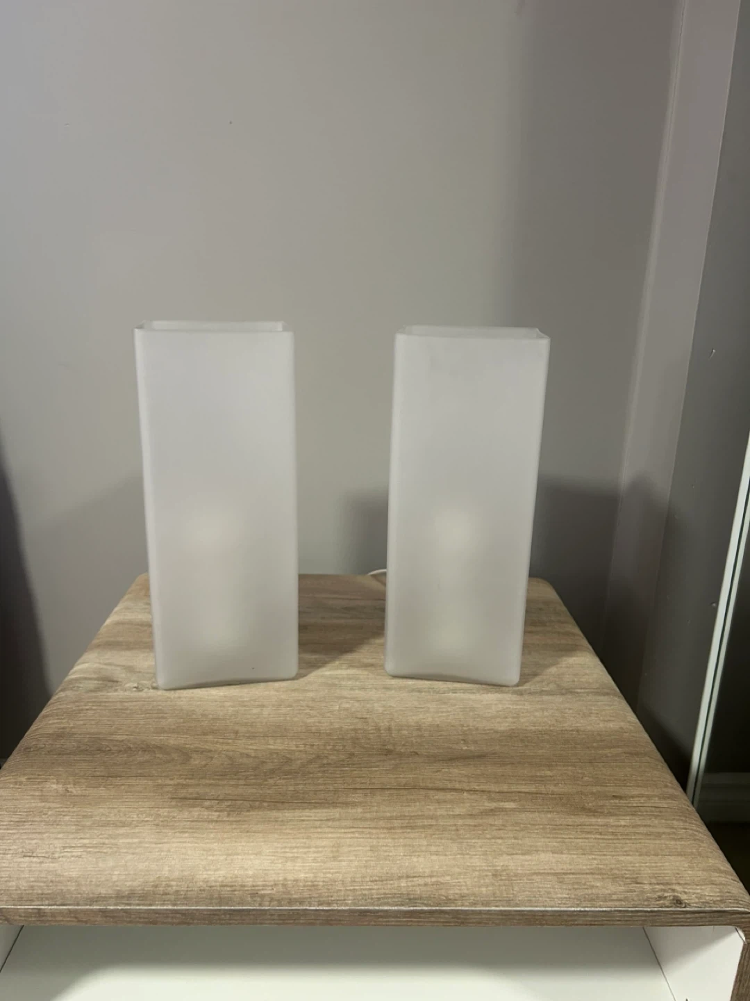 Selling a pair of frosted white table lamps. These lamps have a modern, rectangular design and provide a soft, diffused light. They're perfect for adding ambient lighting to a bedroom or living room.