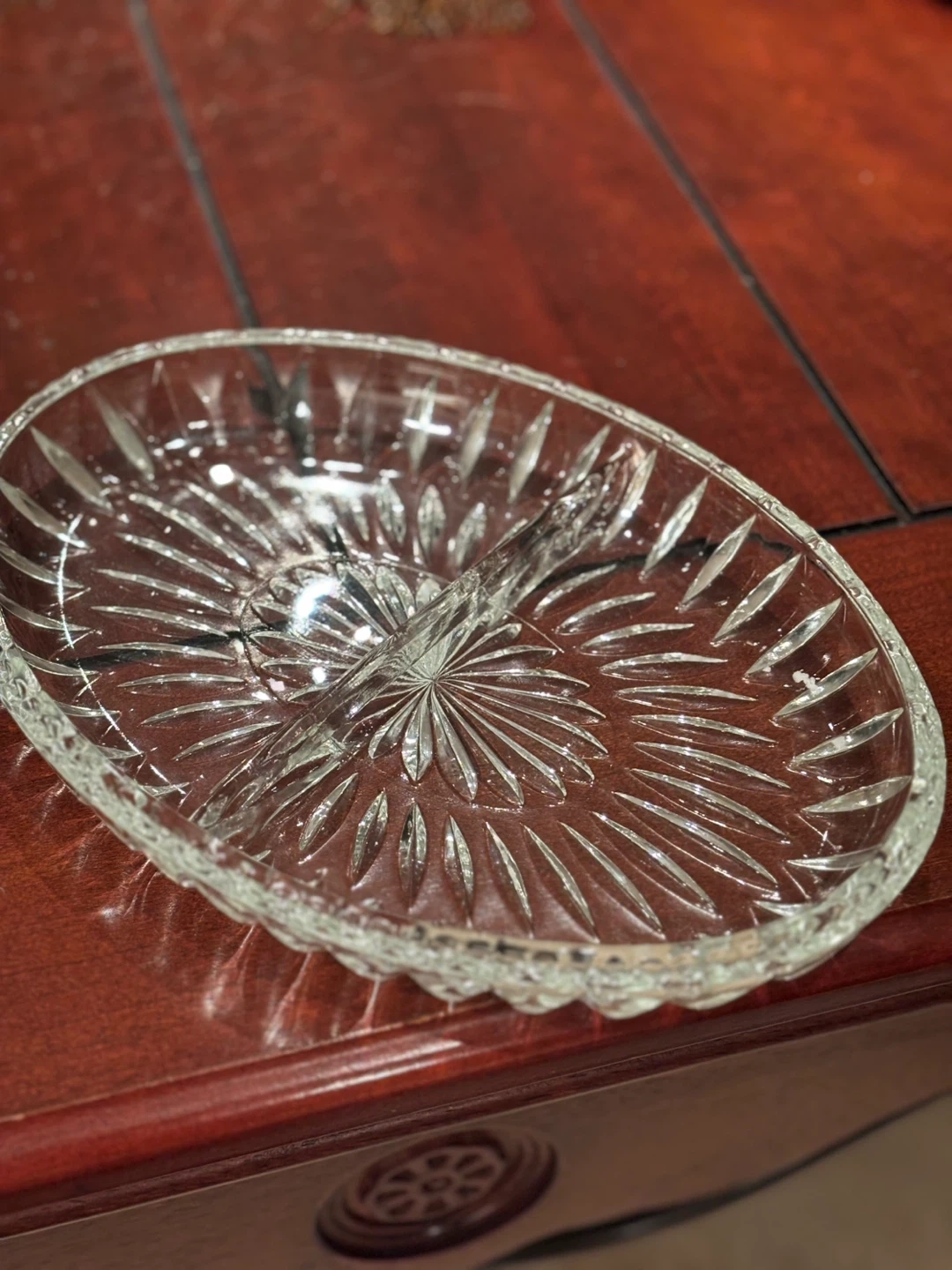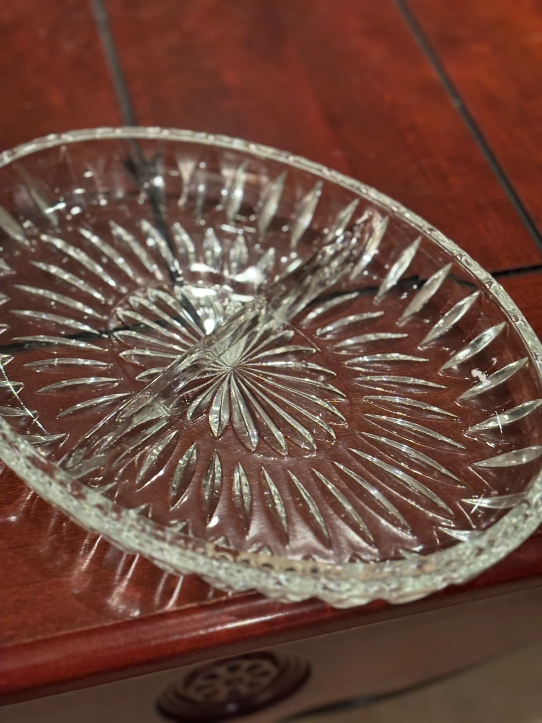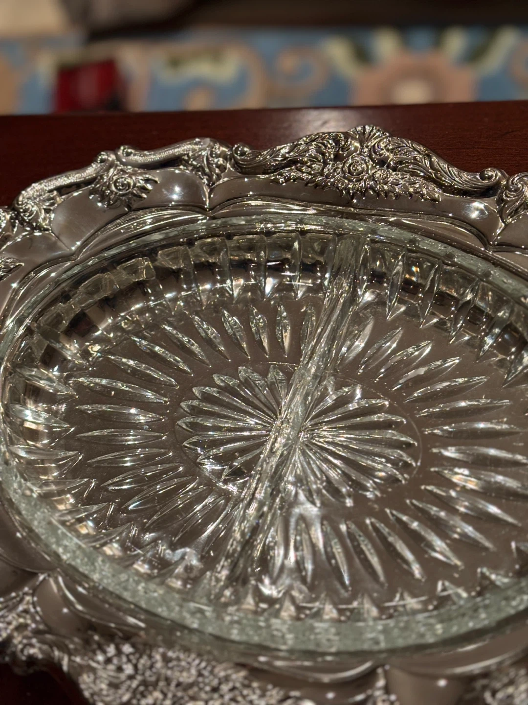 Beautiful divided serving tray featuring a clear, cut glass insert. It's surrounded by an intricately detailed silver-plated ornate frame. This piece is great for serving appetizers or candies!