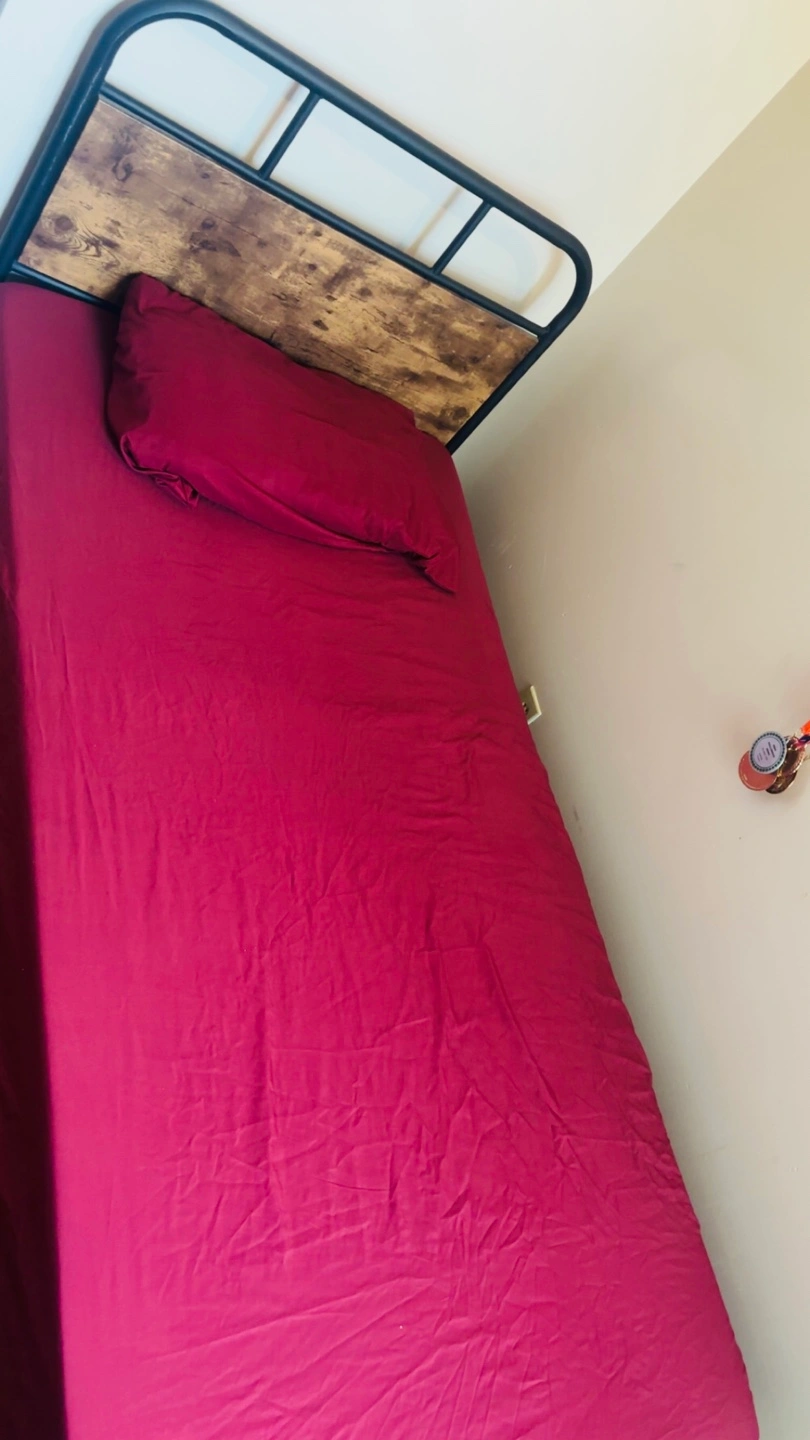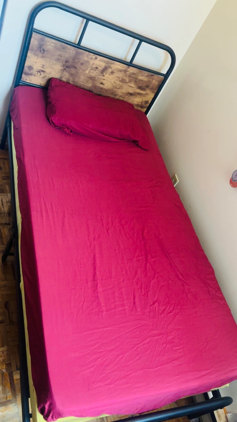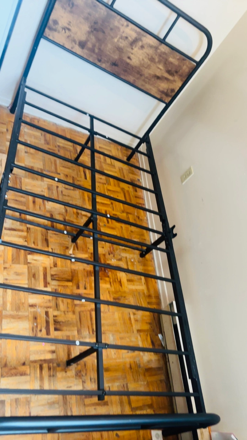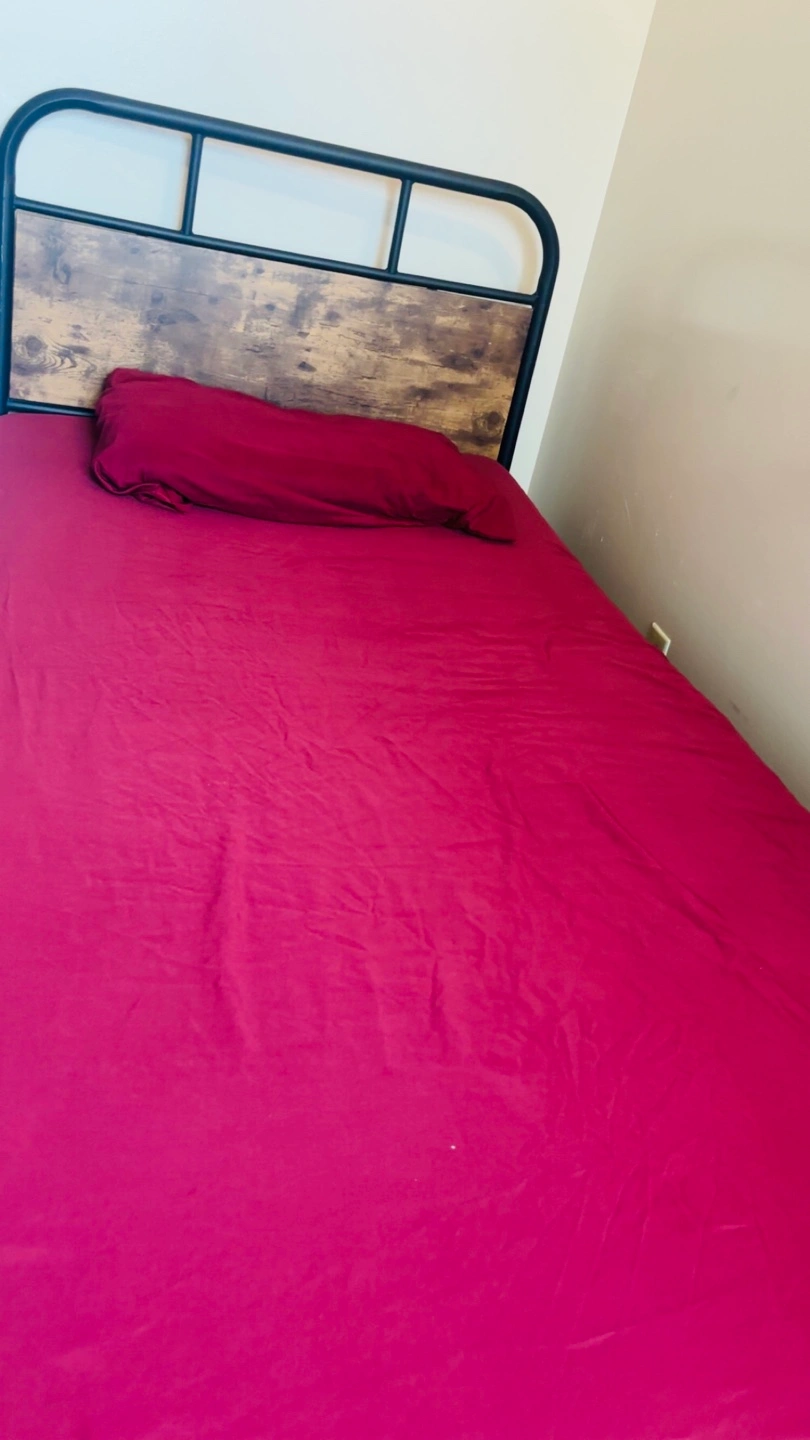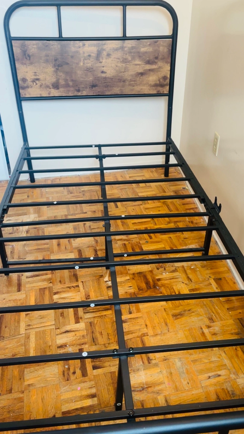 Selling a bed frame with a headboard. The frame is black metal and the headboard has a wood-like finish. It's in good condition and ready for a new home