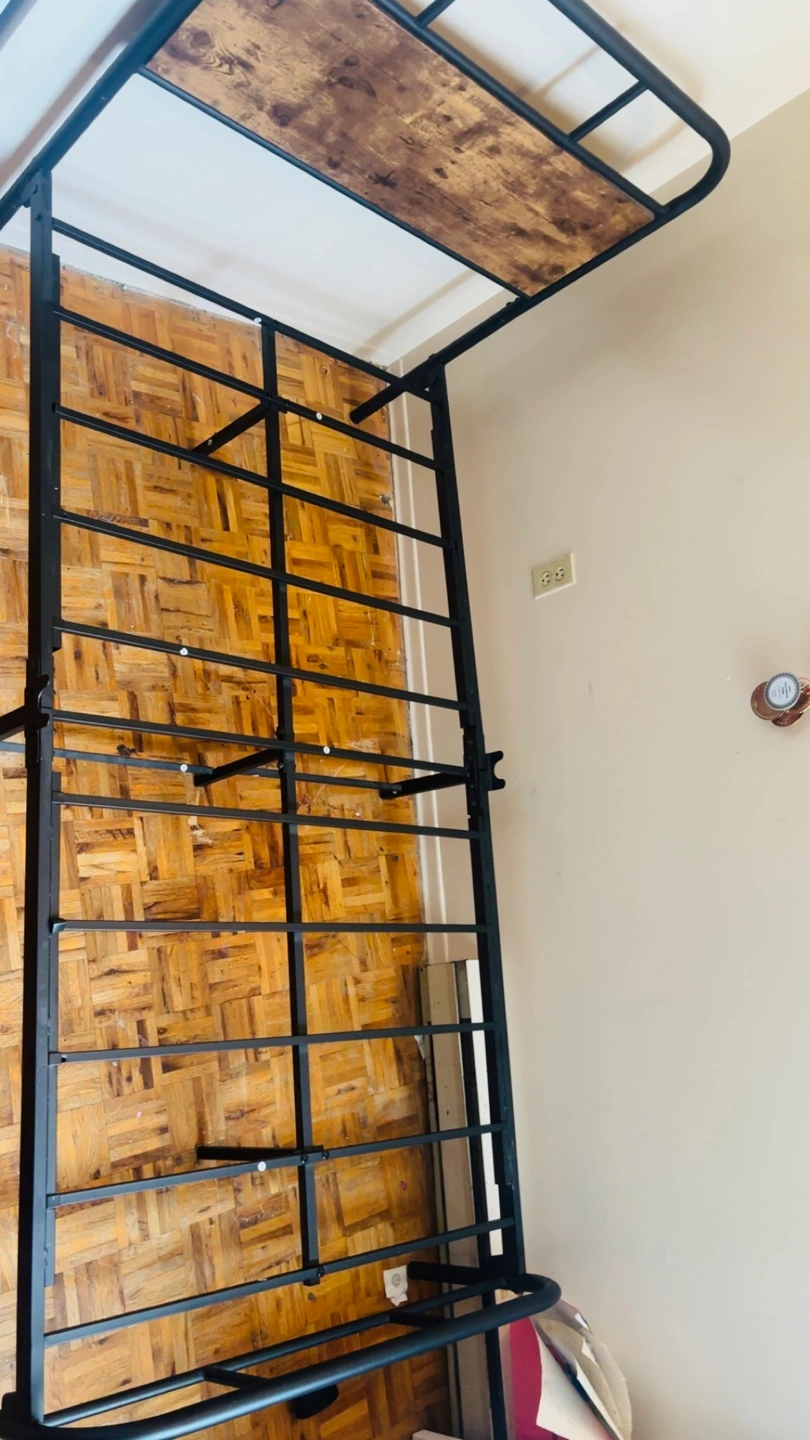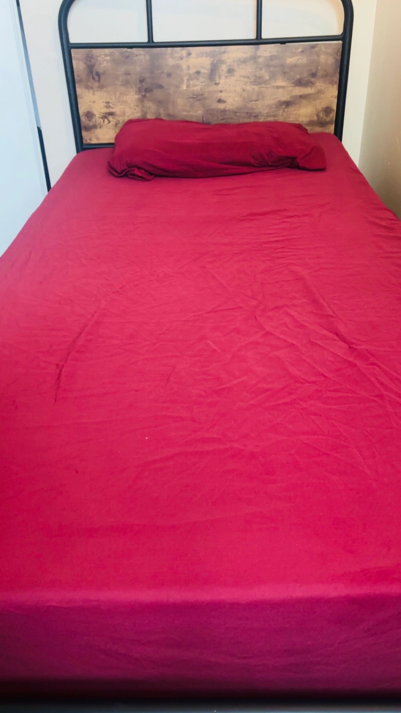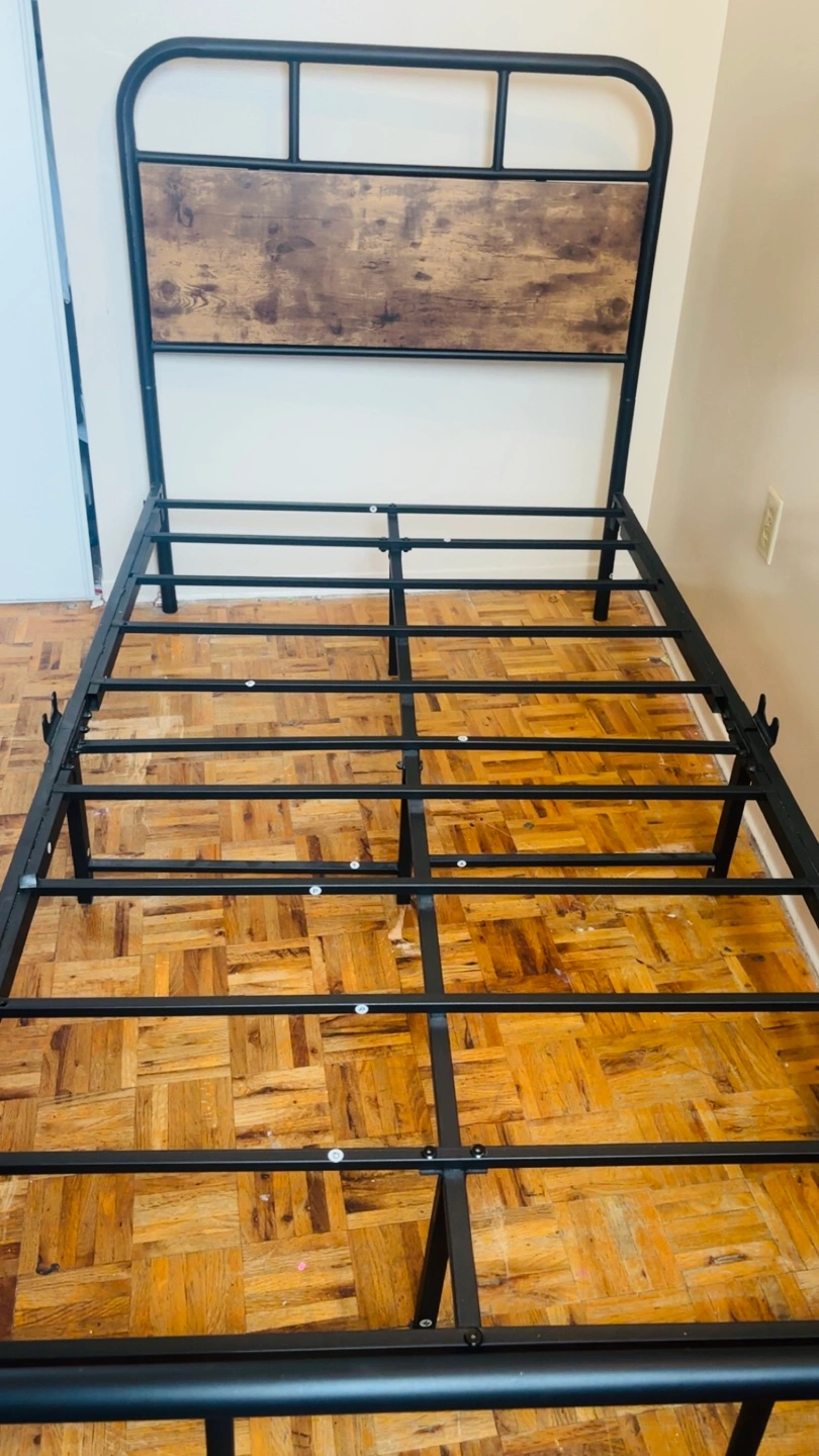 Selling a bed frame with a headboard. The frame is black metal and the headboard has a wood-like finish. It's in good condition and ready for a new home