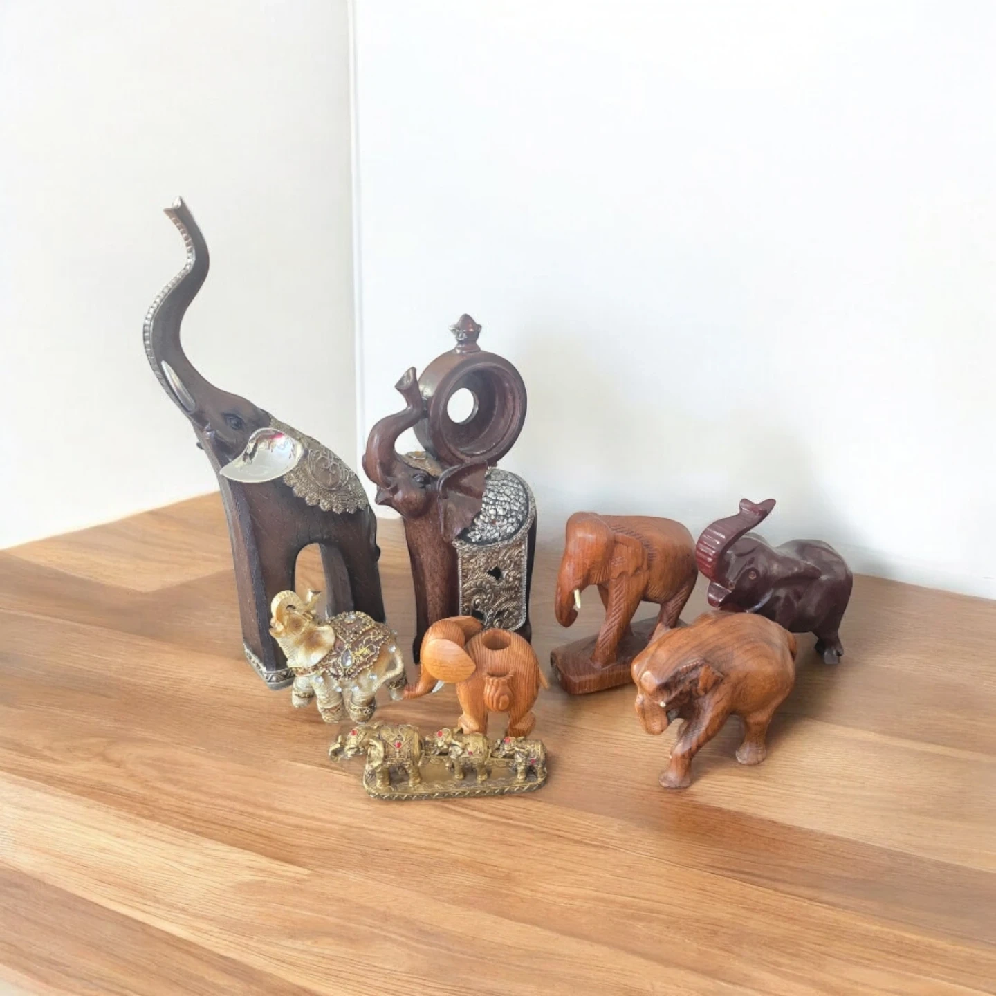 Collection of seven elephant figurines in various sizes and materials. Includes carved wood, resin, and metallic finishes. A lovely set for display!