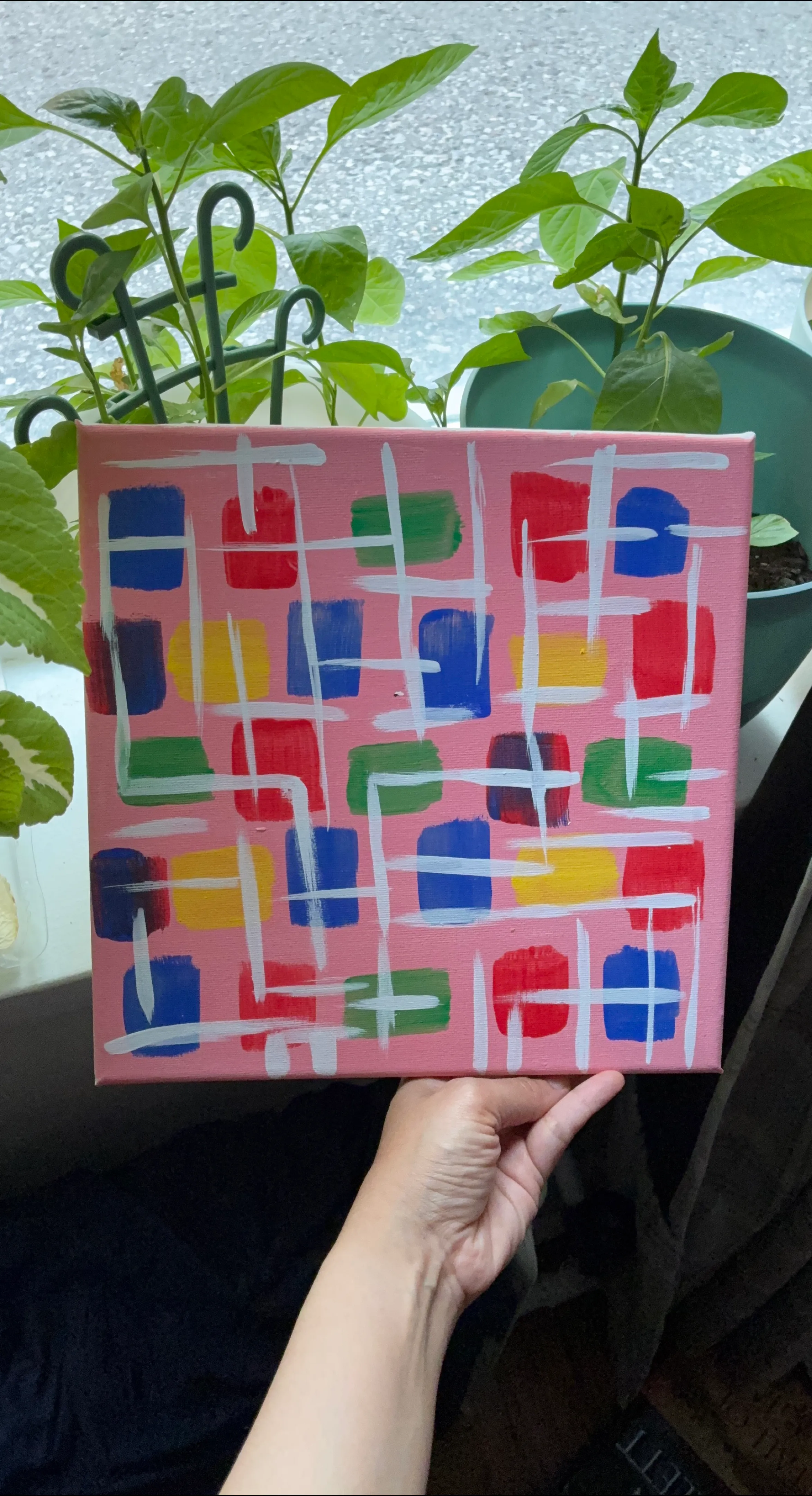 Selling a colourful abstract painting on canvas. It features a pink background with red, blue, green, and yellow squares, and white lines. Perfect for adding a pop of colour to any room!
