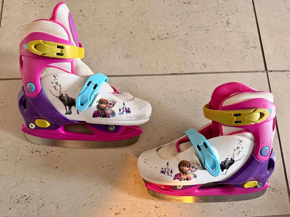 Super cute adjustable ice skates for kids with Anna, Elsa, and Sven from Frozen on them! They come in pink, purple, and white and fit youth sizes Y12 to 2. Perfect for your little princess to hit the ice!