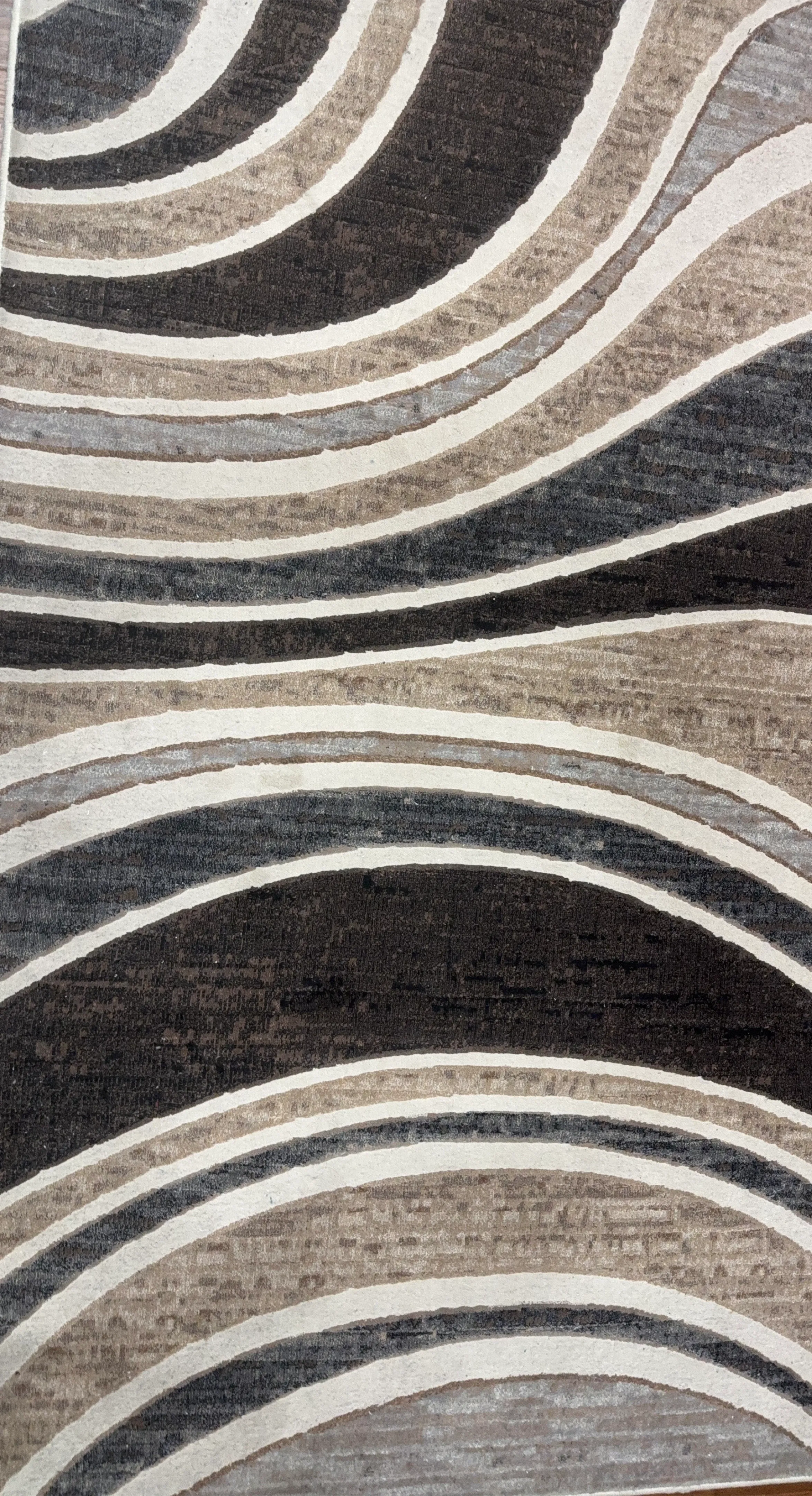 Here's a rug with a wavy pattern in shades of brown, beige, and white. It could add a nice touch to any room!