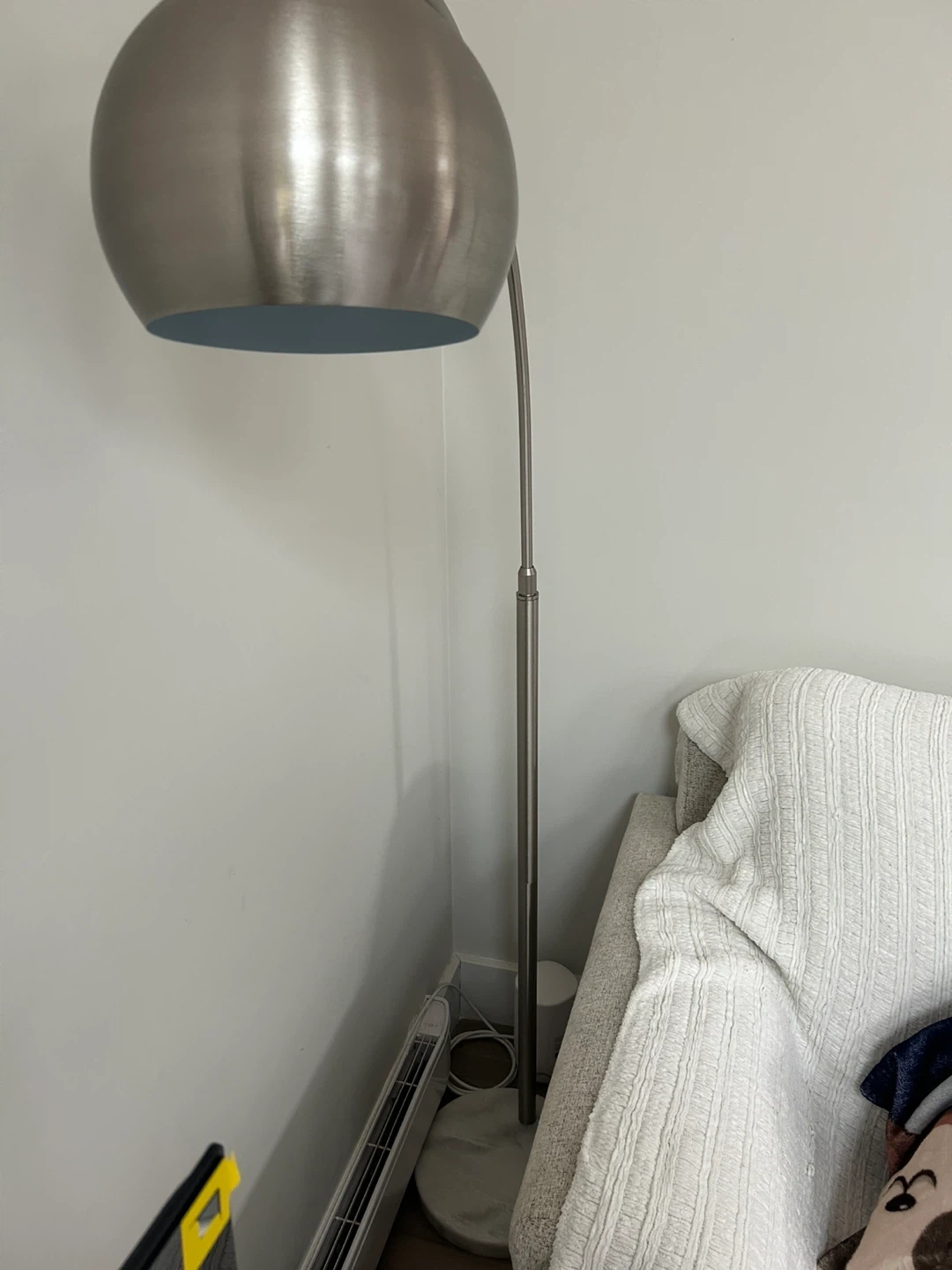 This arc floor lamp has a sleek metal finish and a large, rounded shade. It's a great addition to any living room or reading nook. The lamp has a sturdy marble base and provides ample lighting.