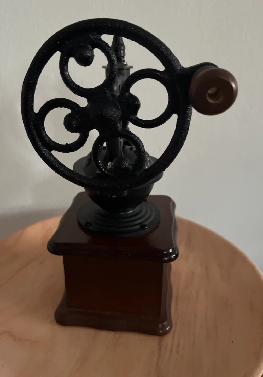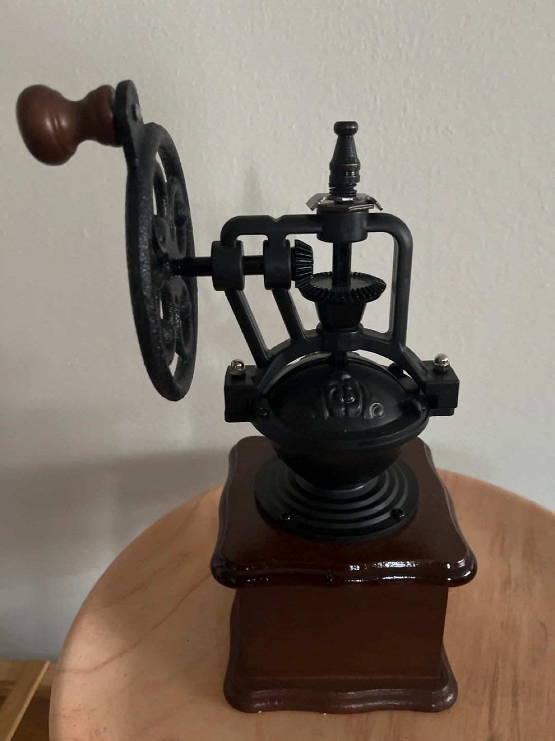 This manual coffee grinder features a vintage design with a wooden base and a cast iron mechanism. It includes a crank for grinding beans and a small drawer to collect the grounds. It's a great piece for a coffee lover's kitchen!