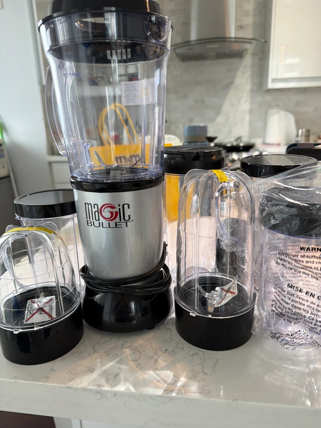 Selling a Magic Bullet blender set! It comes with the blender base, a large blending pitcher, and several smaller blending cups with blades. Perfect for smoothies, sauces, and more!