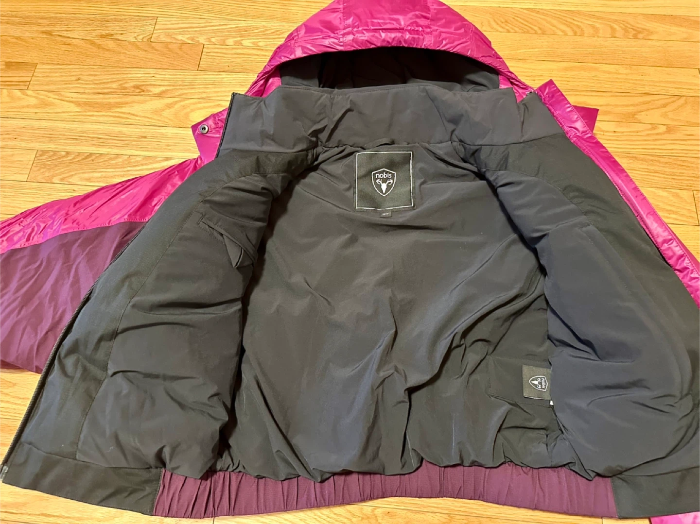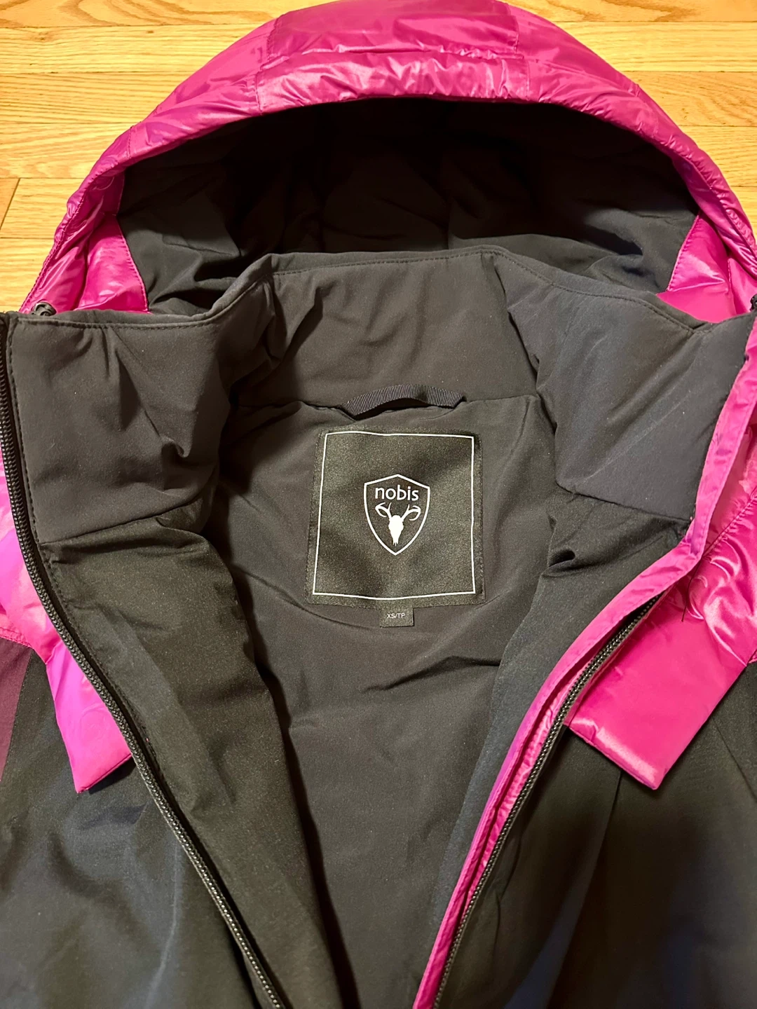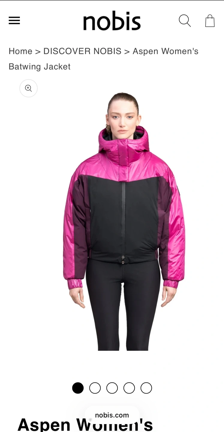 Selling a Nobis Aspen puffer jacket in size XS/TP. The jacket features a stylish colour block design with magenta and black. Perfect for staying warm and fashionable during the colder months!