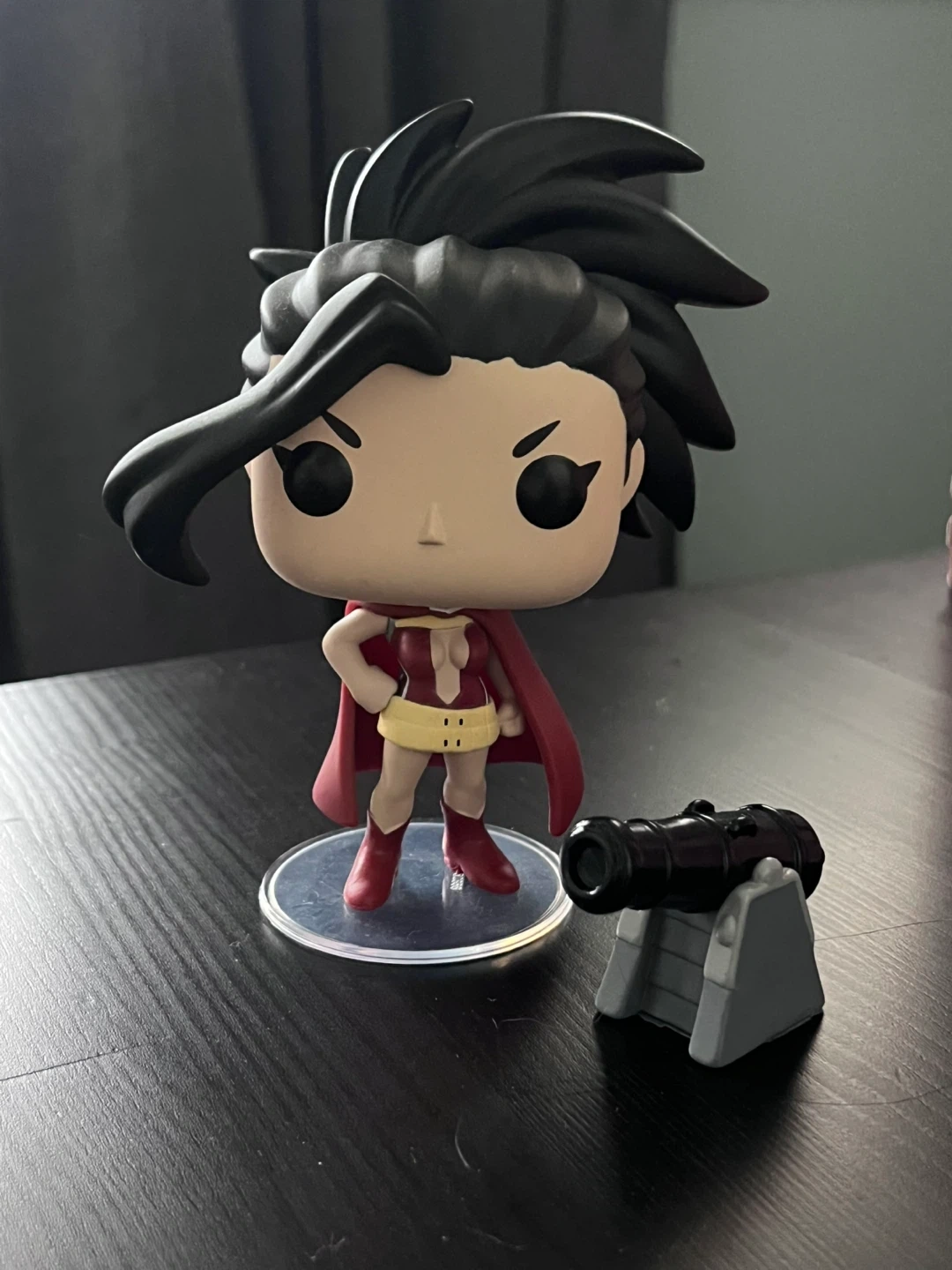 This is a Funko Pop! vinyl figure of Momo Yaoyorozu from My Hero Academia. It includes a clear display base and a small cannon accessory. No box included. This figure is great for any anime fan’s collection.