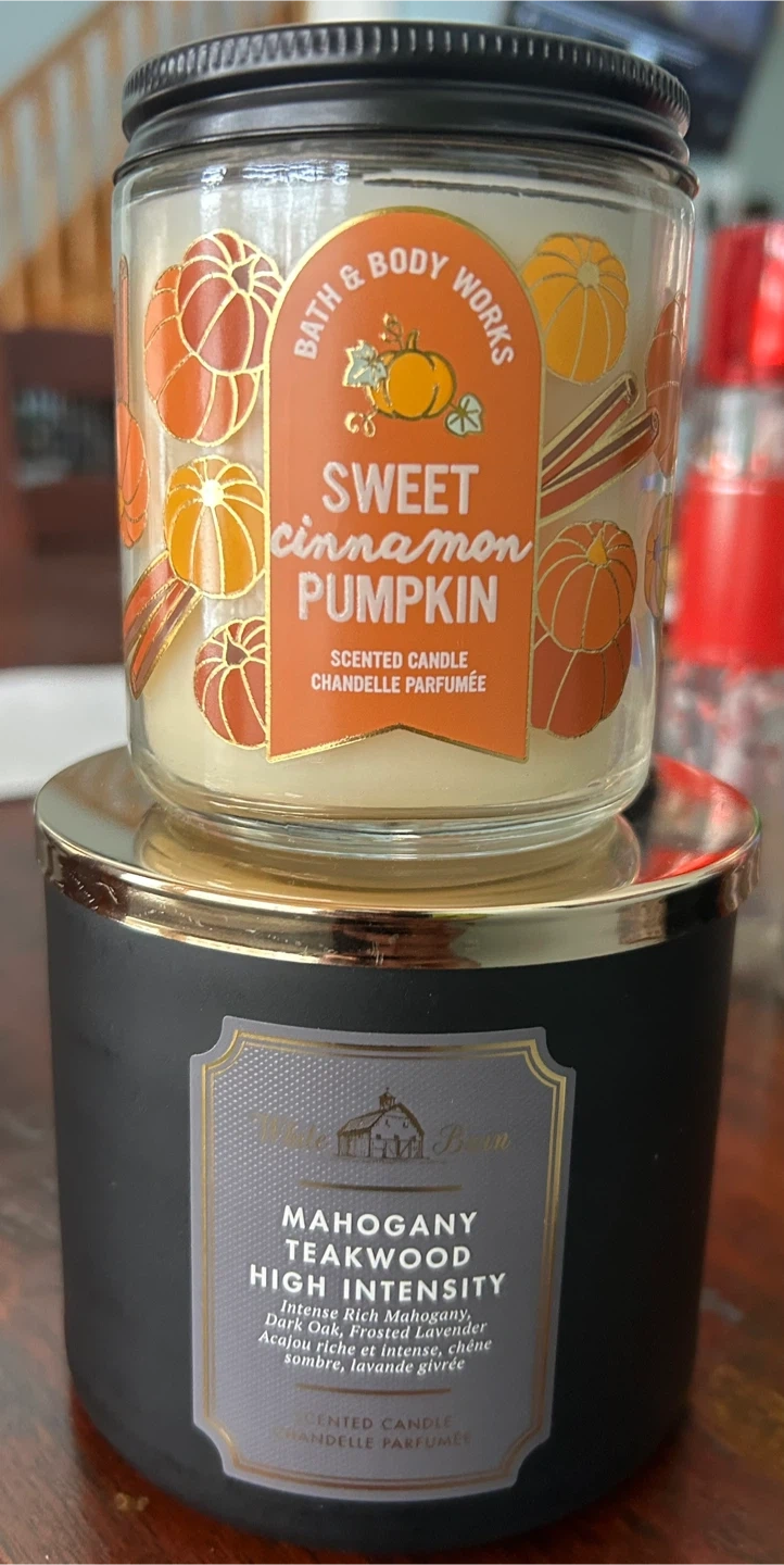I have two Bath & Body Works candles for sale! One is Sweet Cinnamon Pumpkin, and the other is Mahogany Teakwood High Intensity. Both are scented candles.