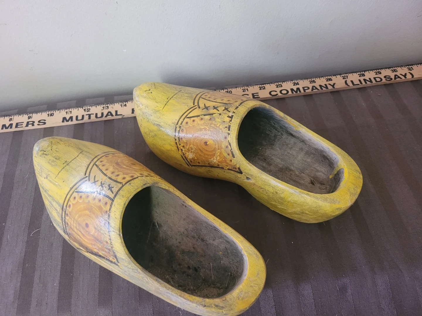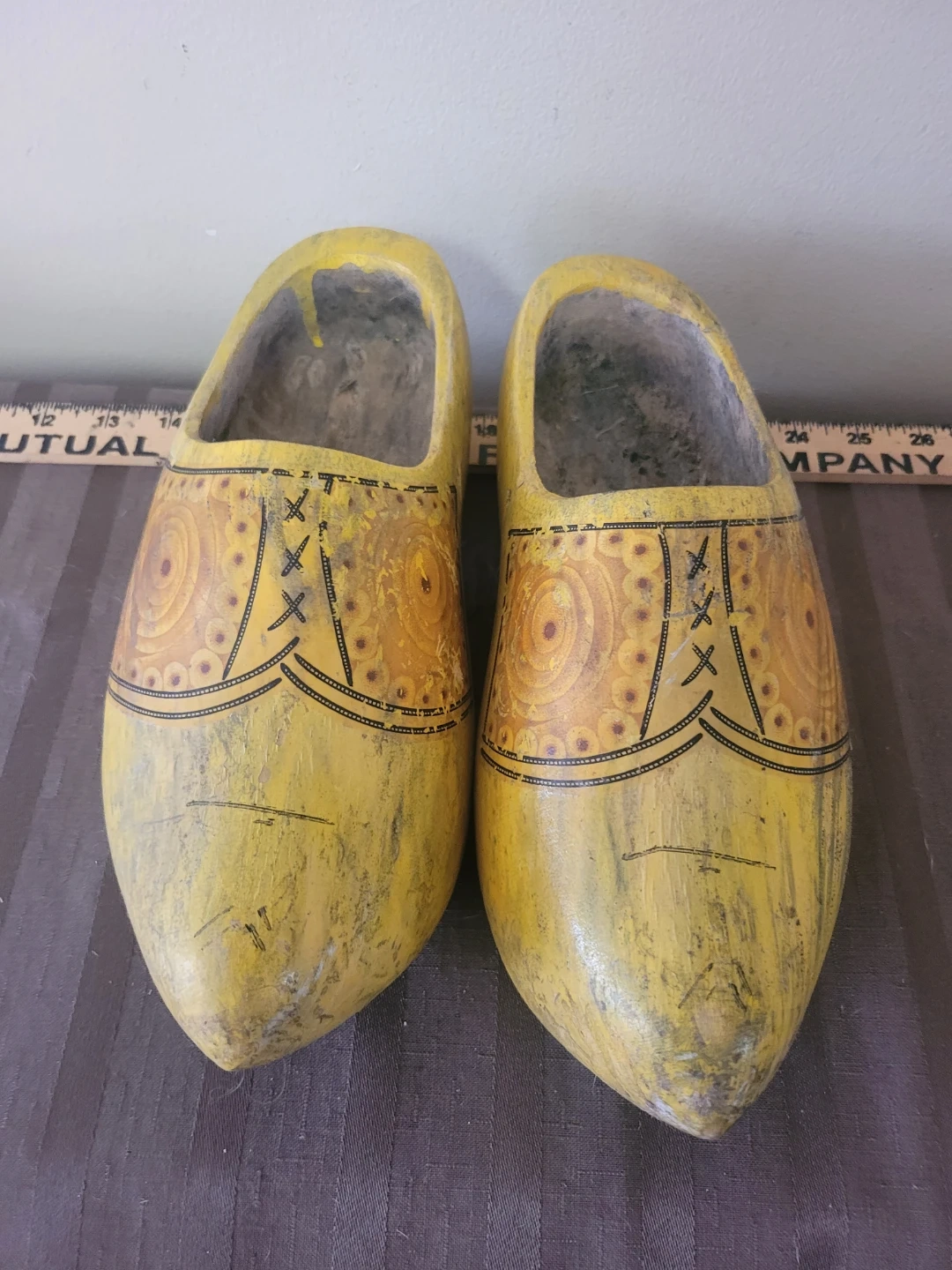 Decorative wooden clogs painted yellow with a traditional pattern. they're hand-painted and would make a charming decor piece. Interior wood is unfinished.