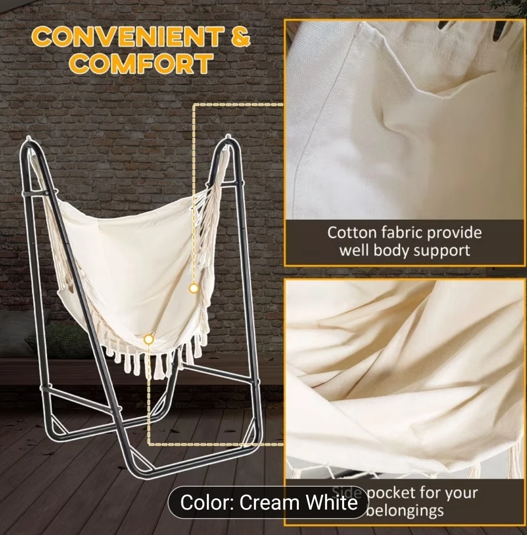 Enjoy ultimate relaxation with this cream white hammock chair. It's made with cotton fabric for great body support and includes a side pocket for your belongings. Perfect for your backyard or patio!