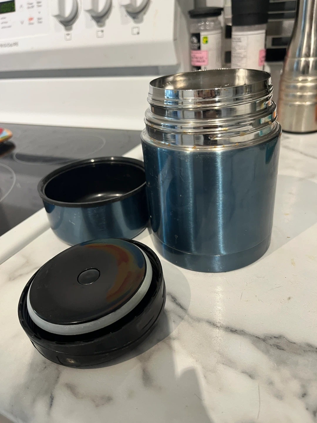 Keep your meals warm or cold with this insulated food jar. It's made of stainless steel with a blue exterior and a secure black lid. Perfect for packing lunches or hot soups on the go!
